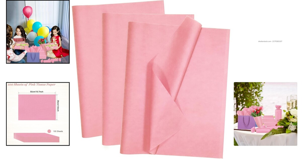 Includes 100 sheets of luxurious pink tissue paper, size 14 x 20 inches.