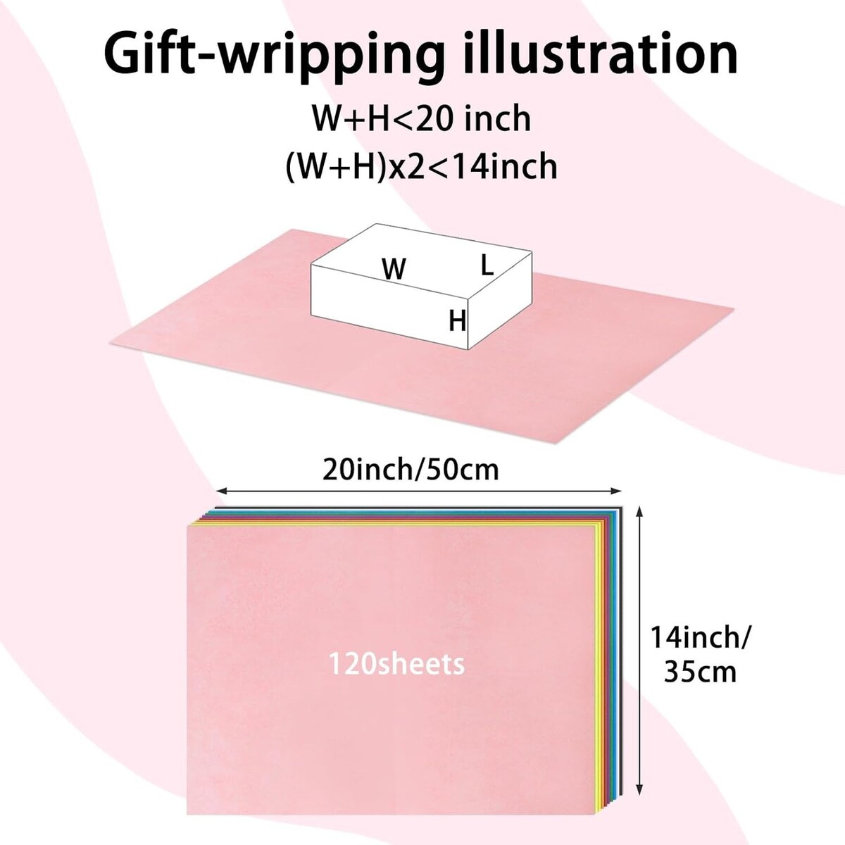 120 sheets of vibrant 14"x20" (35.5cmx50.8cm) colorful wrapping tissue paper.