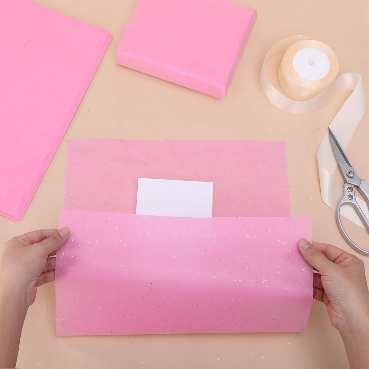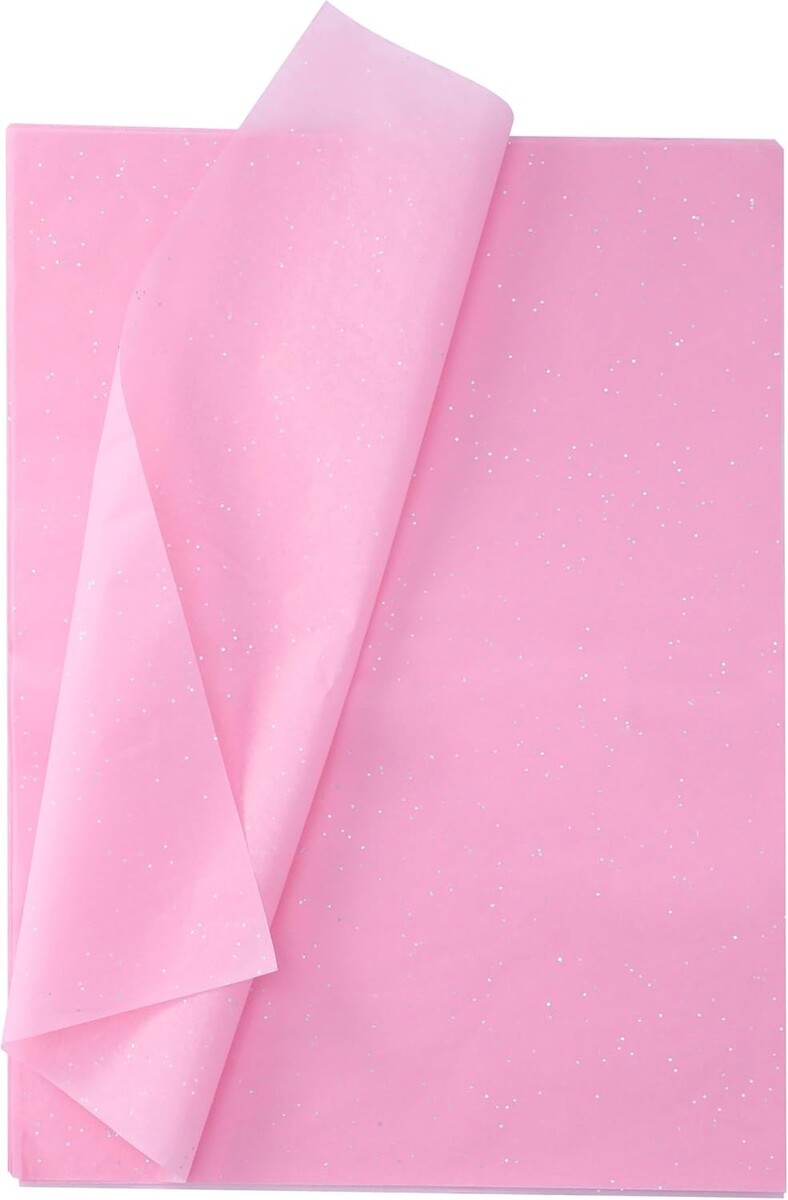 Quantity: This pack includes a generous collection of 120 sheets of pink tissue paper, all featuring a sparkling glitter finish for various uses.