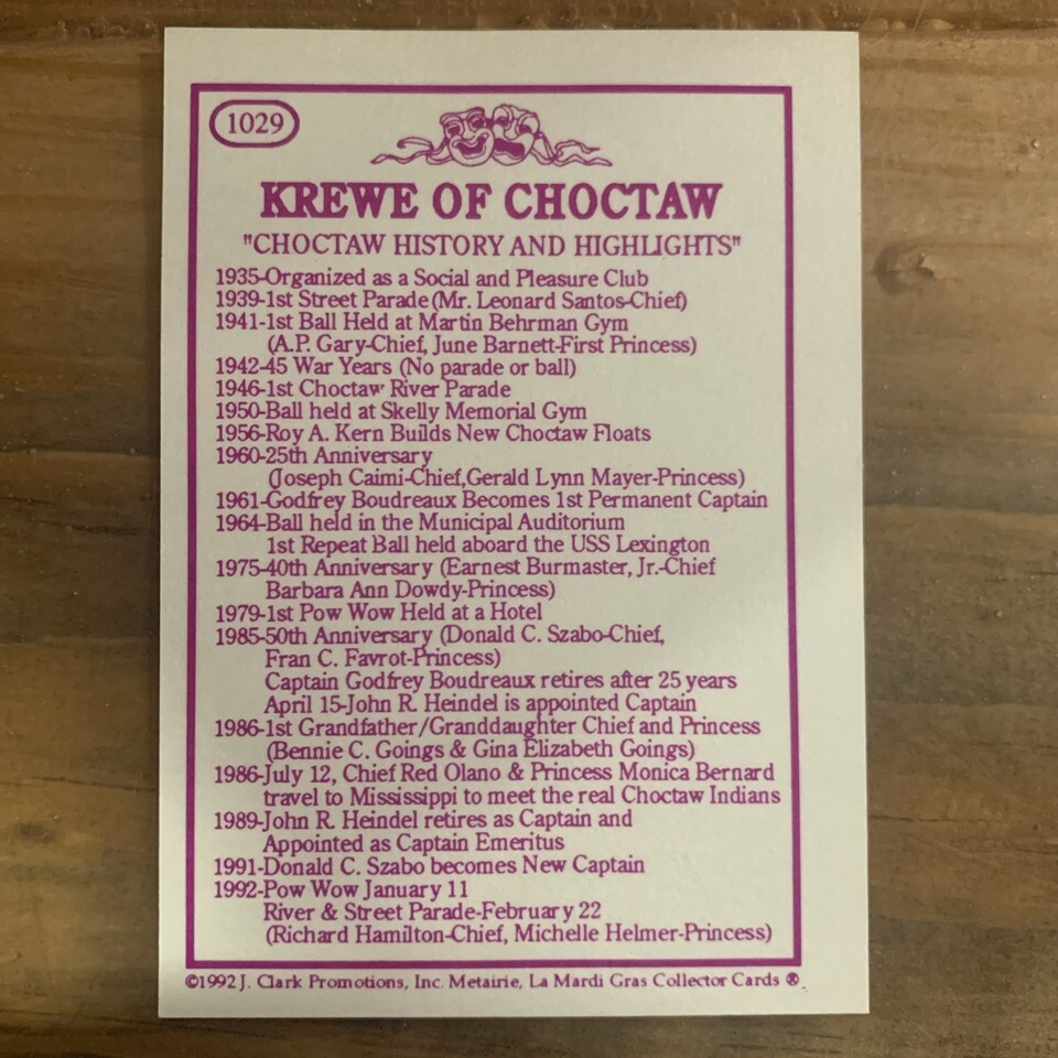 The Vintage Krewe of Choctaw Card is a colorful Mardi Gras collectible made of card stock, manufactured in the United States in 1992. It features a unique design representing the Krewe of Choctaw, adding a touch of nostalgia to any Mardi Gras celebration. Perfect for collectors or those looking to add a bit of festive flair to their Mardi Gras attire, this vintage card captures the spirit and traditions of the annual festival.