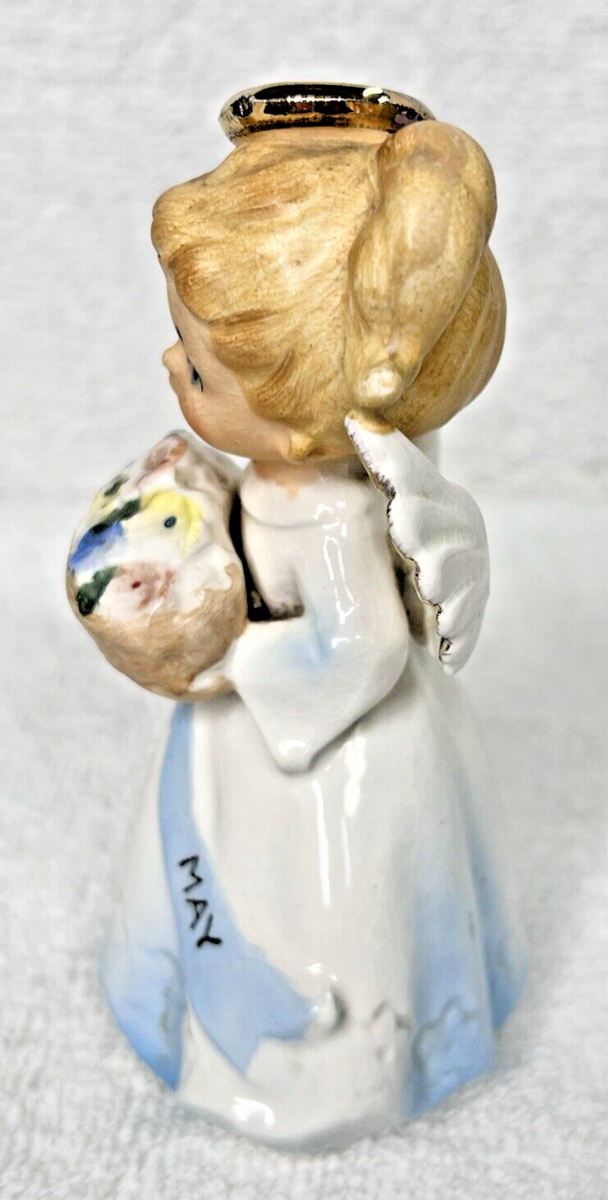 Vintage Japan MAY Birthday Blode Ponytail Angel w Flower Basket 5 " Tall