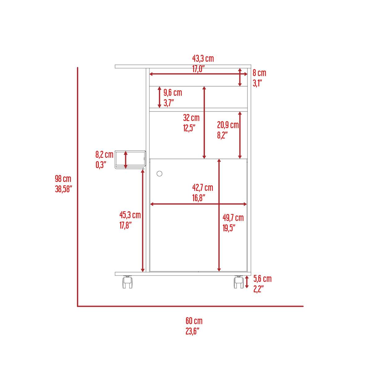38.58 inches high x 23.6 inches wide x 14.96 inches deep