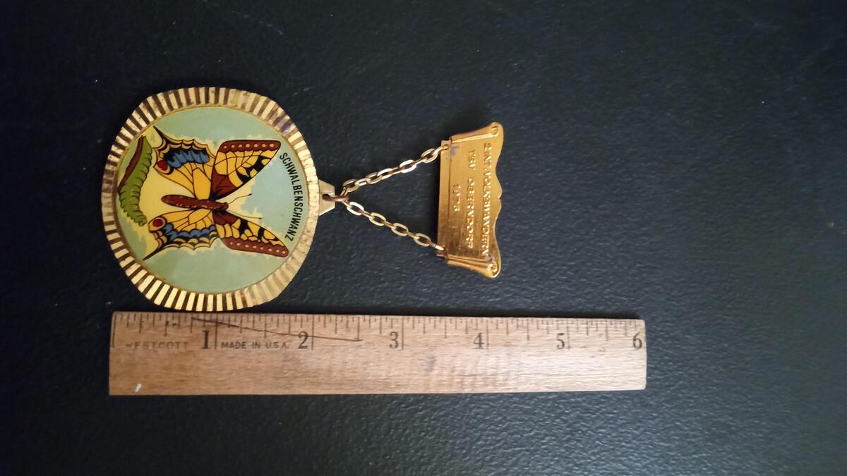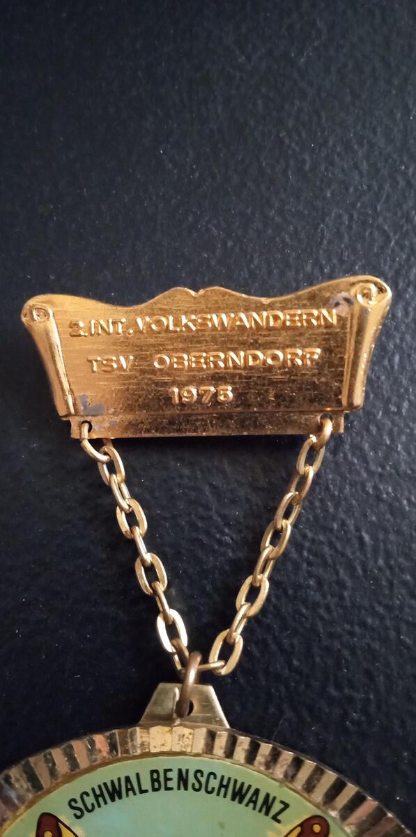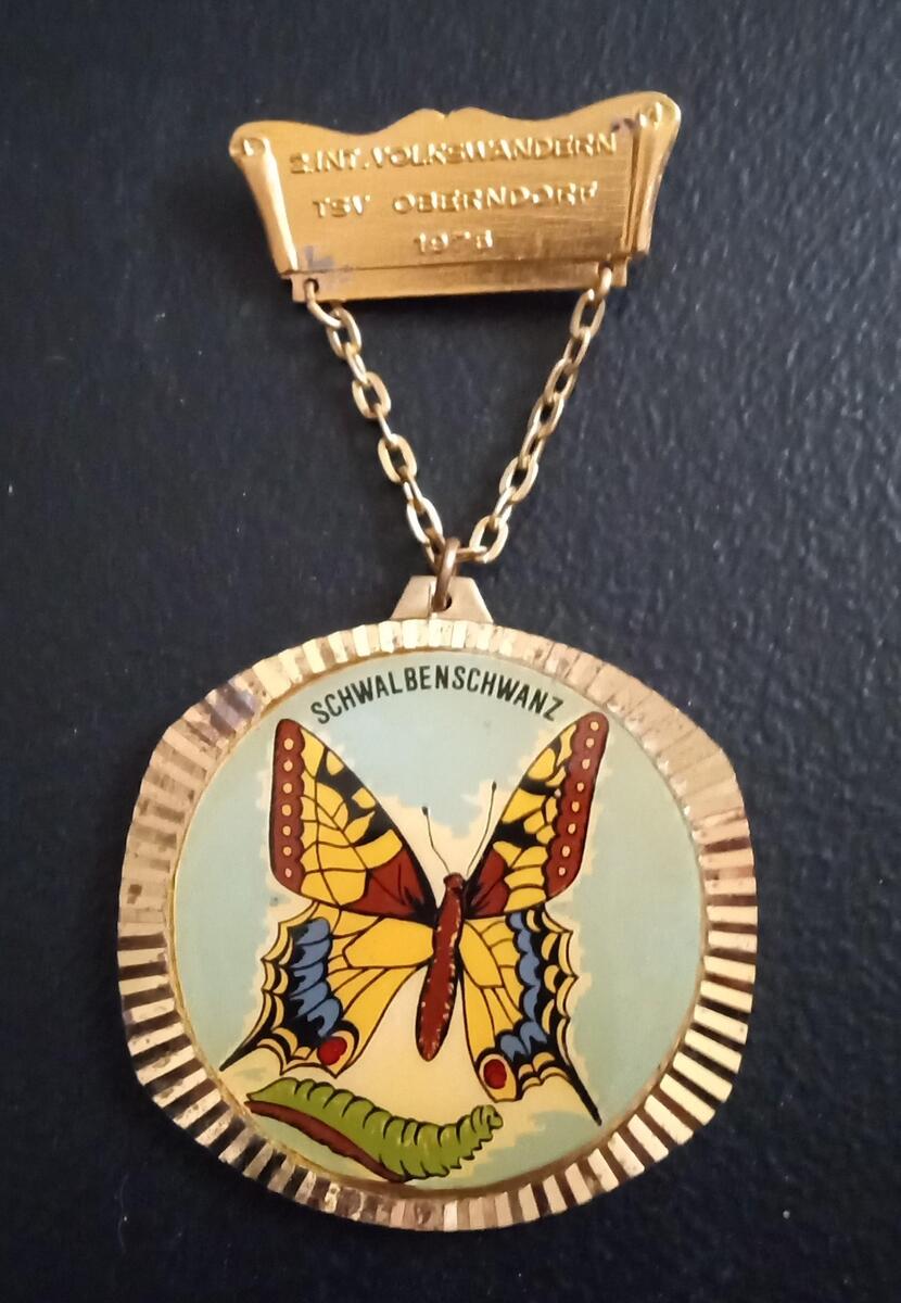 Here we have a hiking medal from 1975, Volkswandern is a family hiking event, this one taking place in Oberndorf, Germany. This medal features a "schwalbenschwanz" or swallow tale butterfly. This medal is in beautiful condition with bright appealing colors.