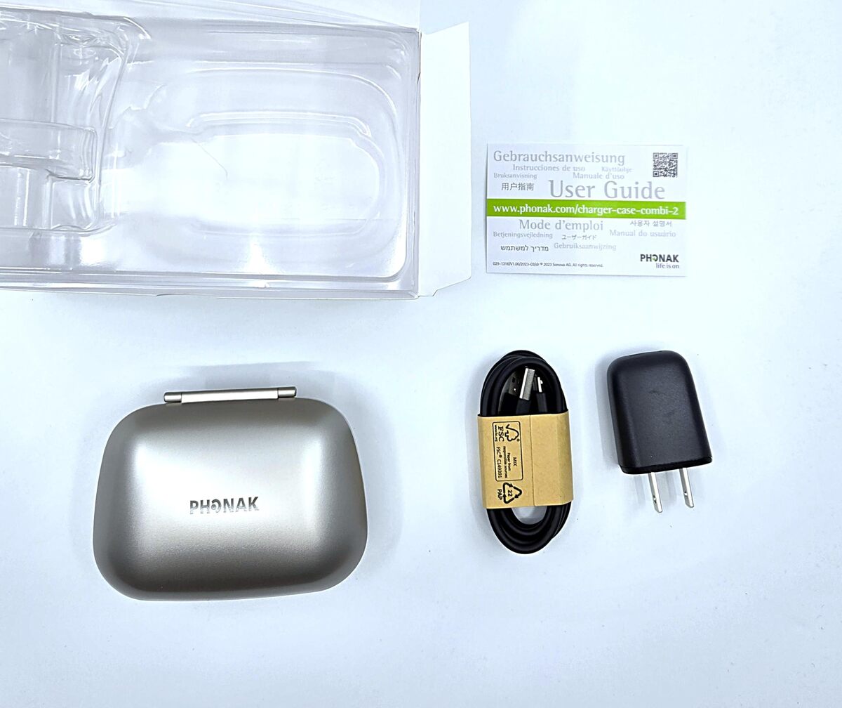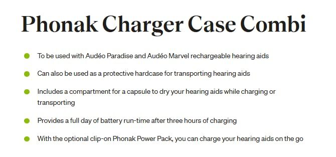 Product description: The Combi 2 is a hearing aid charger that doubles as a durable protective hardcase for traveling. It includes a compartment for a capsule to dry your hearing aids while charging or transporting (drying capsules not included). This device charges your hearing aids for a full day in only 3 hours of charging time. The convenient indicator lights show when your aids have reached their fully-charged status. Charger does require it be plugged into the wall charger while charging your aids, however this device is compatible with the Phonak Power Pack (sold separaetly) which attaches to the bottom of the device and allows for on-the-go wall-free charging of your aids. Compatible with Audeo Lumity, Marvel, and Paradise hearing aids and these specific listed models: Phonak Audeo P-R (P90/P70/P50/P30/Trial) Phonak Audeo P-RT (P90/P70/P50/P30/Trial) Phonak Audeo P-Fit (P90/P70/P50/P30/Trial) Phonak Audeo M-R (M90/M70/M50/M30/Trial) Phonak Audeo M-RT (M90/M70/M50/M30/Trial) Phonak Audeo B-R (B90/B70/B50/B30/Trial) Phonak CROS P-R Phonak Audeo L-R (L90/L70/L50/L30/Trial) Phonak CROS L-R NOT COMPATIBLE WITH LUMITY LIFE DEVICES (Audeo L-RL) Box includes: Information to access instructions, USB-C charging cable, and charging block. This is a hearing aid charger only, hearing aids are not included with purchase. Compatible external power packs are also sold separately.