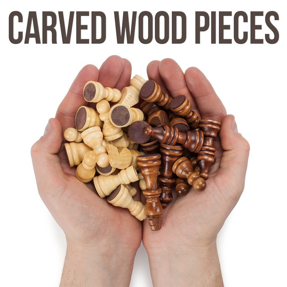 Each playing piece features a felt-lined bottom for easy movement on the chess board. There are 16 lightwood pawns and 16 darkwood pawns carved in the Staunton style. The squares on the board measure 1.5 inches, and the playing pieces range in height from 1-2 inches.