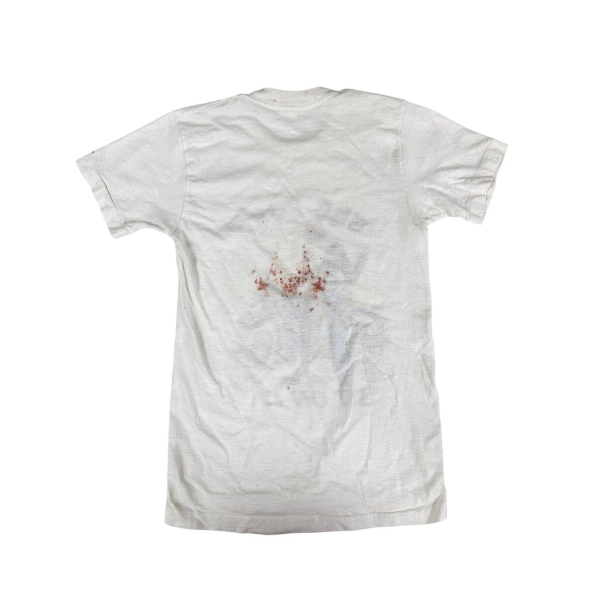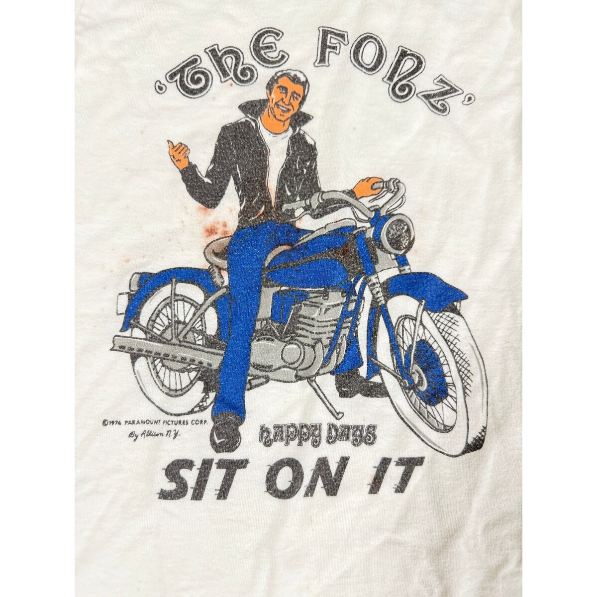 Authentic vintage 1974 Paramount ?The Fonz / Sit On It? T-shirt ? an early licensed Happy Days piece featuring the iconic catchphrase. Marked Boys L (14/16). In rare original condition, with some dark red stains as shown.