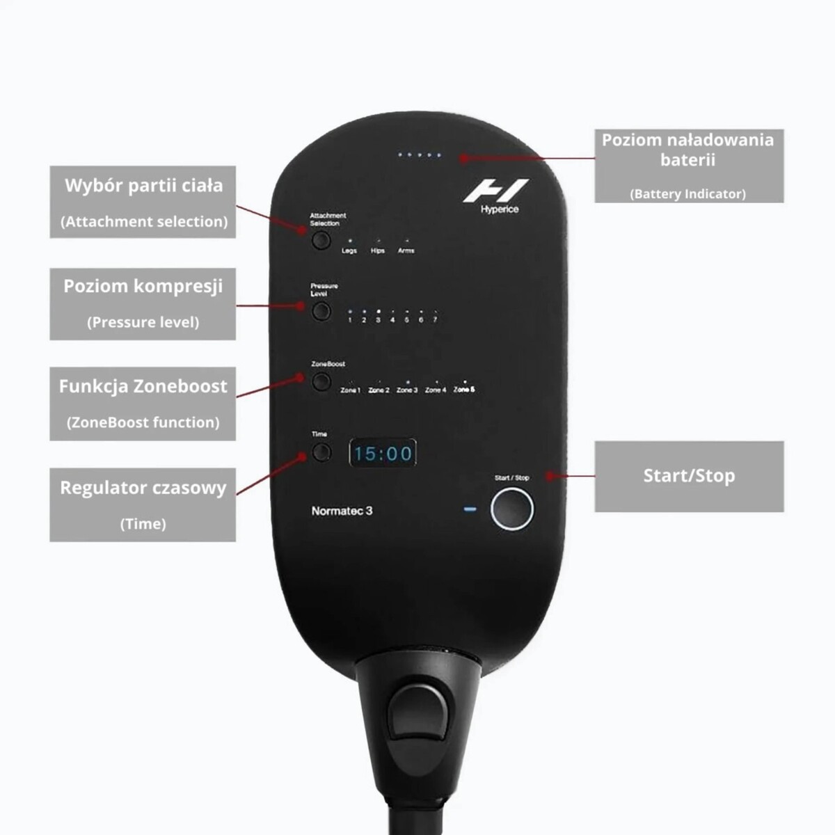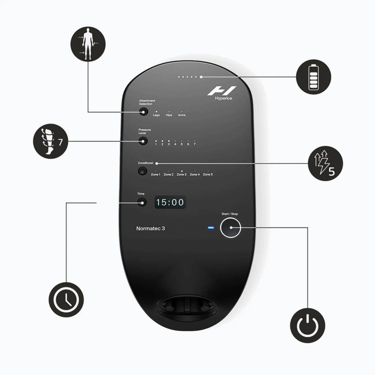 Normatec 3s refreshed system design features an intuitive interface, reduced weight, and the ability to unlock next-level features and customization through the Bluetooth connected Hyperice App. Simply zip in and power up the most advanced dynamic air compression system on the planet. Power Button located on side of device.