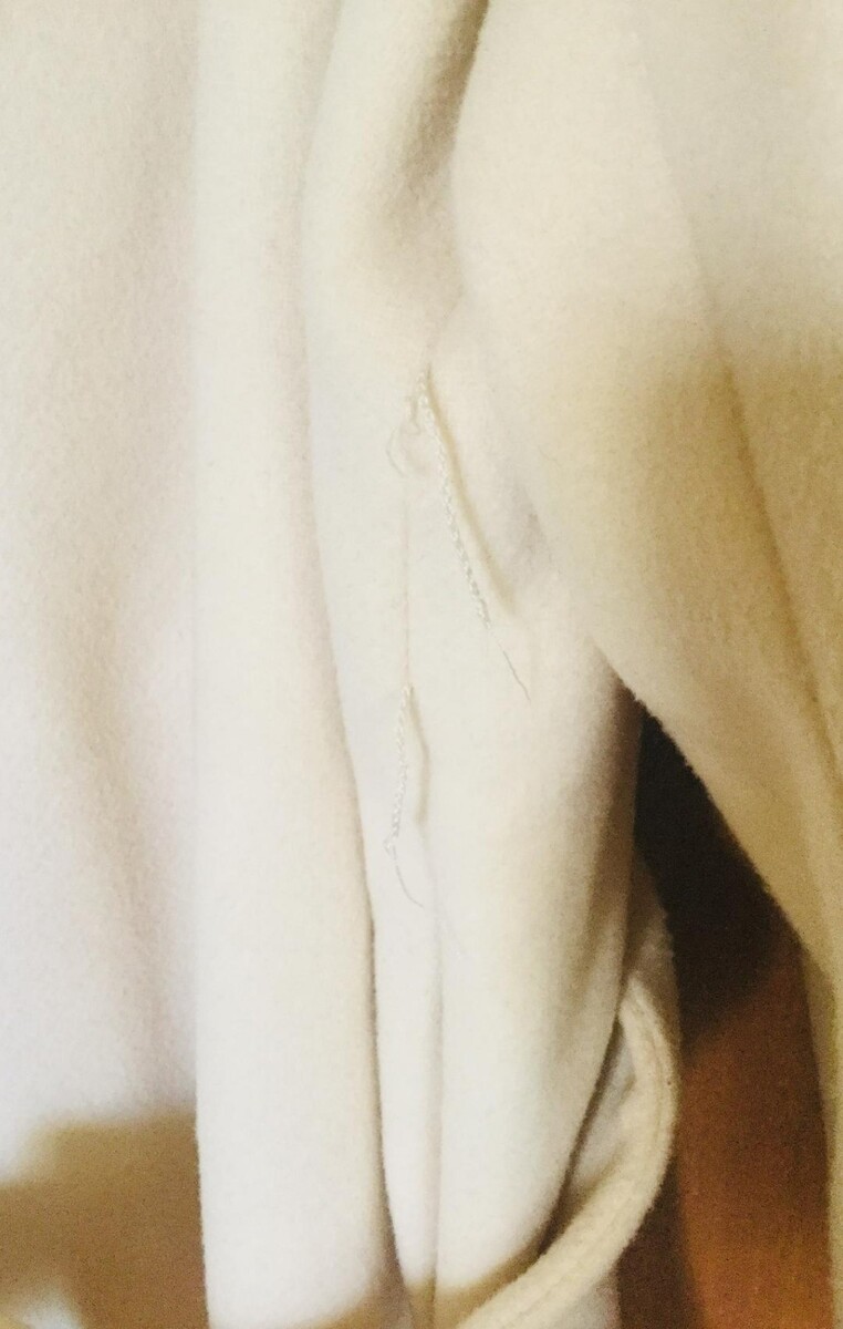 Coat made of wool blend yarn. V-neck and long sleeves. Hidden buttons ~ Hidden in-seam pockets. Adjustable self-tie fabric belt. Interior lining. Straight hem..