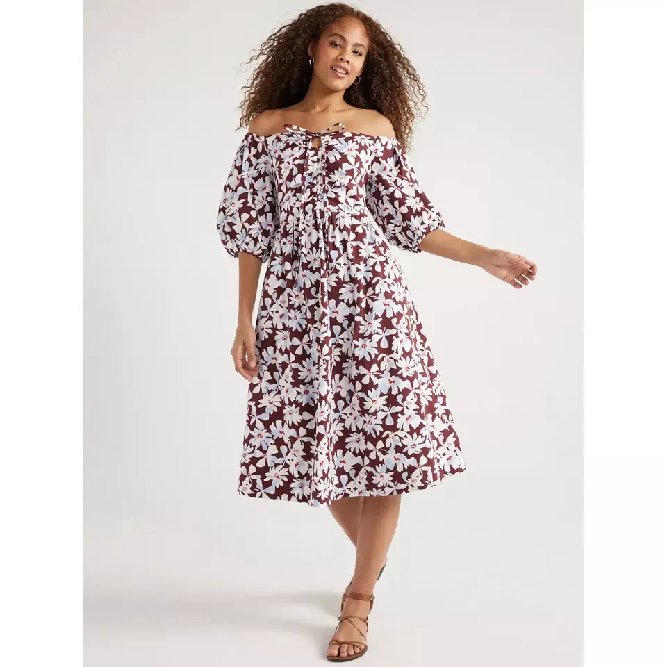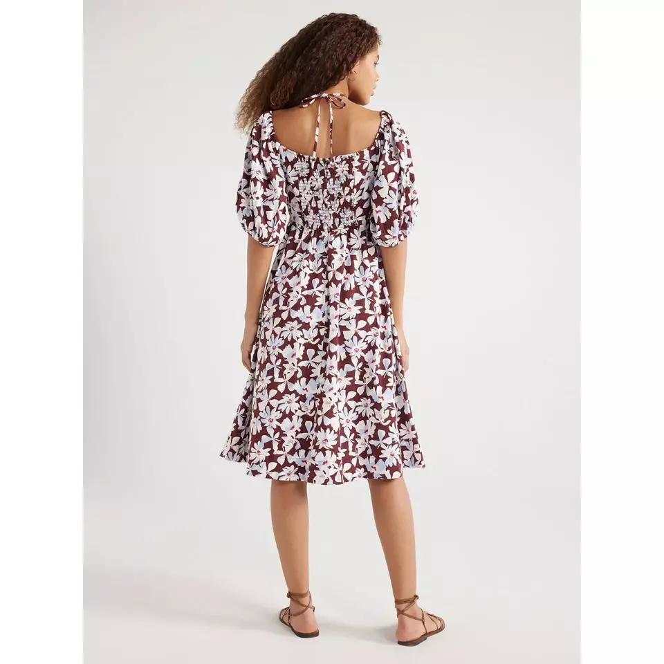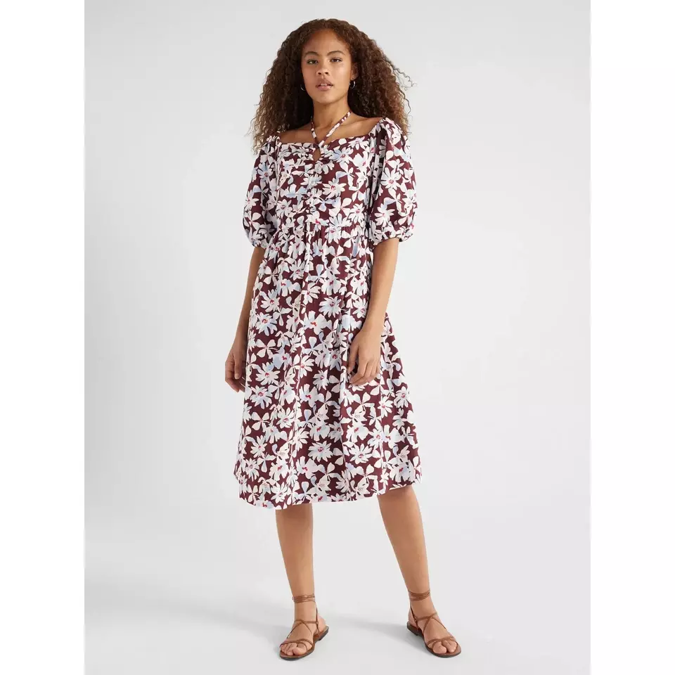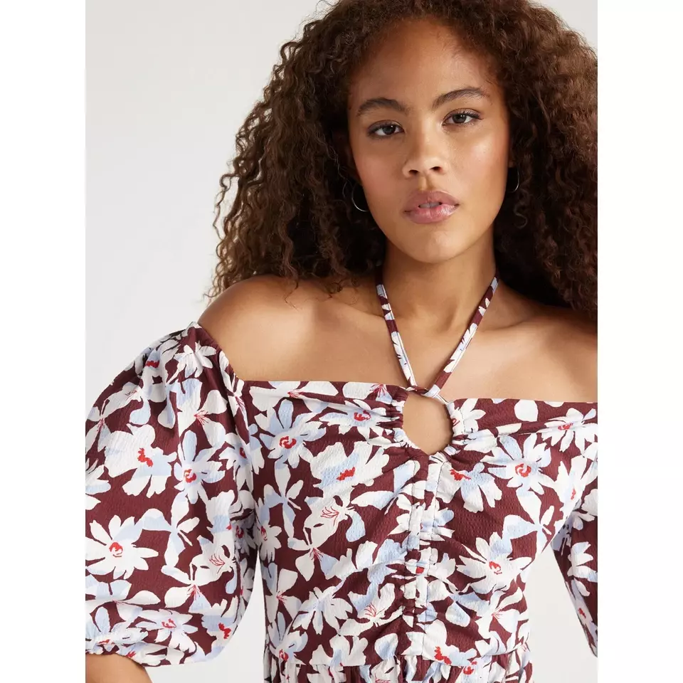 Free Assembly Womenโs Ruched Halter Dress with Puff Sleeves