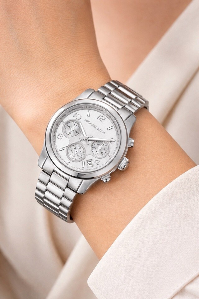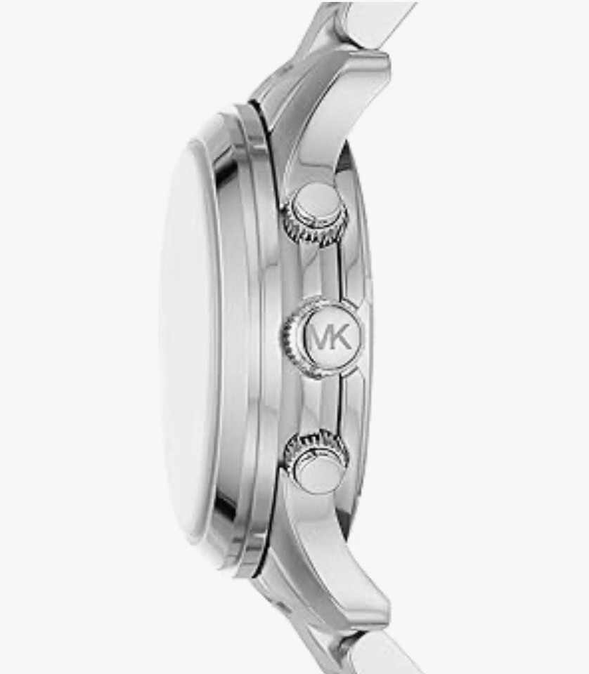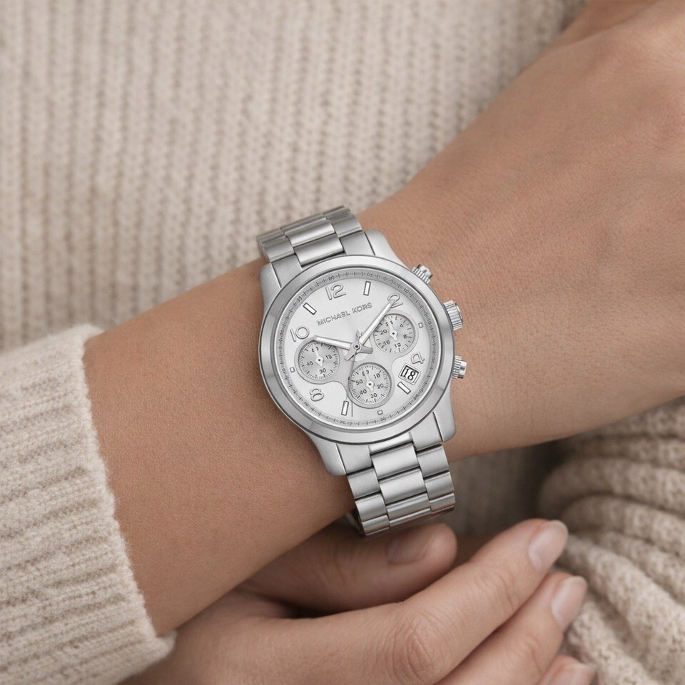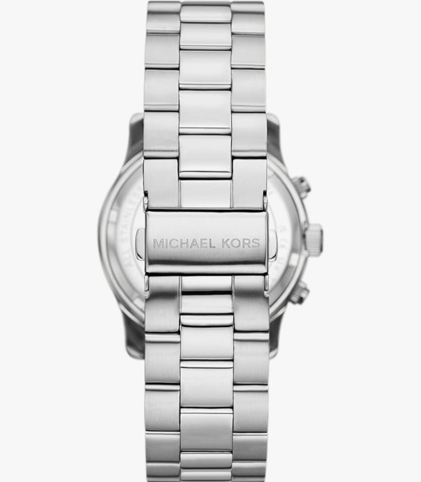 Sleek and sophisticated, this 38 mm Michael Kors Runway watch features a silver stainless-steel case and matching bracelet with adjustable links. The silver dial is protected by a scratch-resistant mineral crystal and powered by precise quartz movement with chronograph, date display, and 24-hour sub-dial. Water-resistant to 100 m (10 ATM), it's perfect for both daily wear and light water activities.