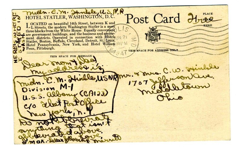 Mailed from Annapolis Maryland with FREE Frank in 1947. Hotel Statler Washington DC FREE Frank Postcard . A Midshipman sent this postcard to inform the recipient of his new address on the U S S Albany CA123.