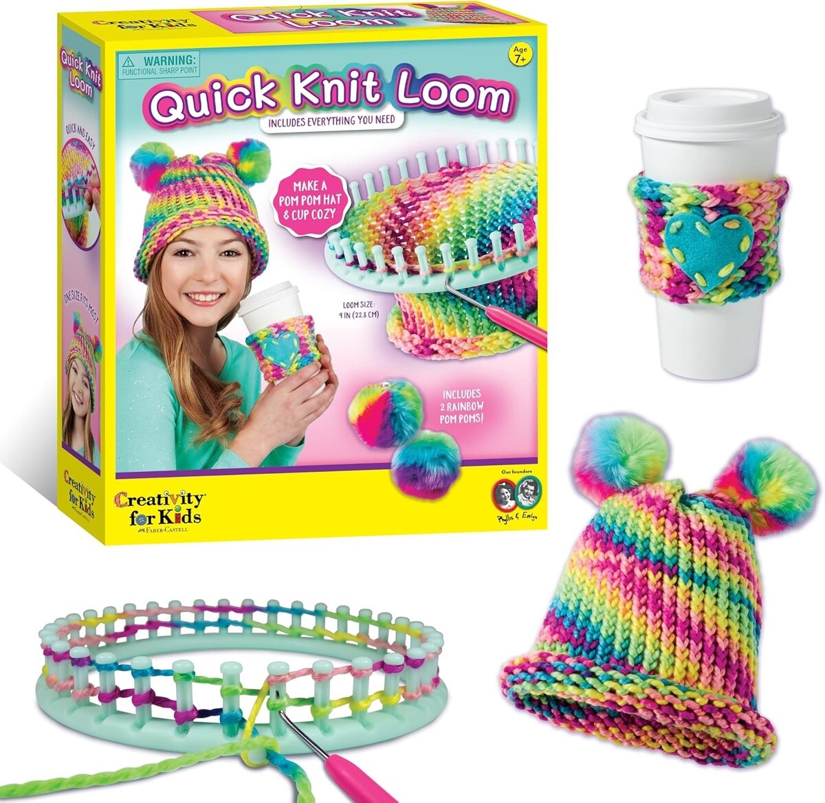 Includes 90 yards of bright rainbow yarn and a 9" round loom for endless possibilities.
