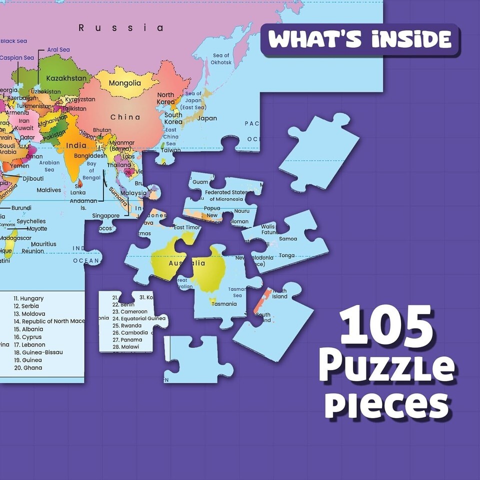 WHAT?S INSIDE: This set includes 105 top-notch puzzle pieces that come together to create a vibrant world map, making it a fantastic way for kids to dive into geography.
