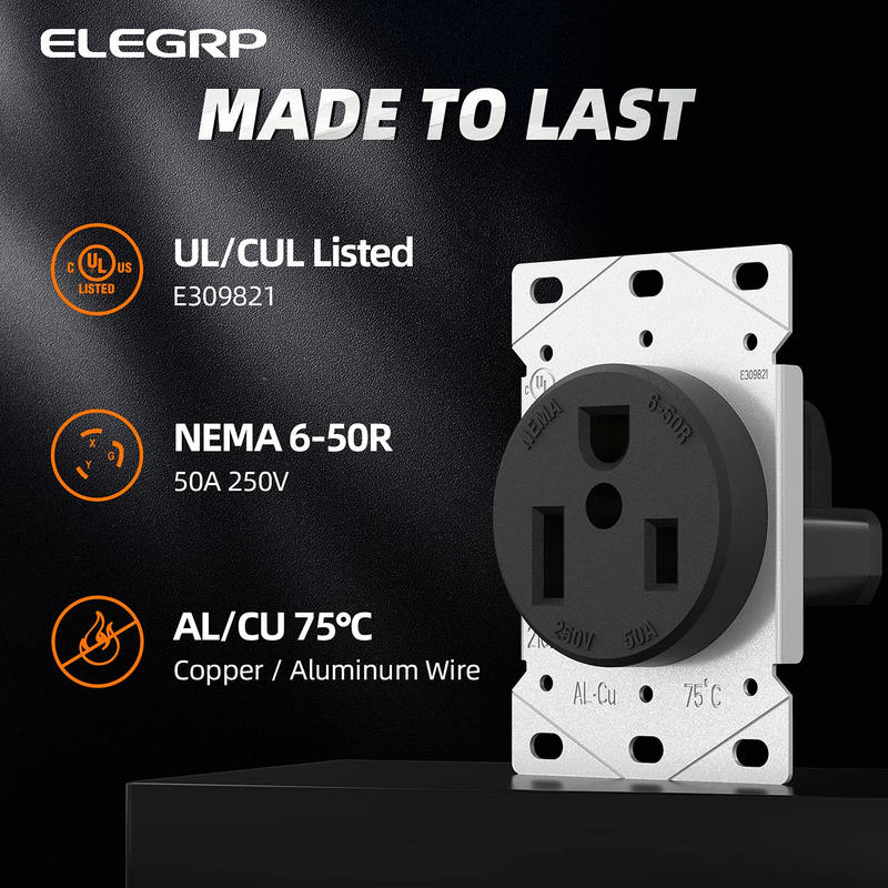 ??Specifications ? 50 Amps 250V, NEMA 6-50R, 2 Pole 3 Wire, UL Listed. Flammability rating is V-2 per UL94, Industrial Grade and Heavy Duty, Straight Blade, Grounding. Fits all wall plates with 2.15" diameter center hole.