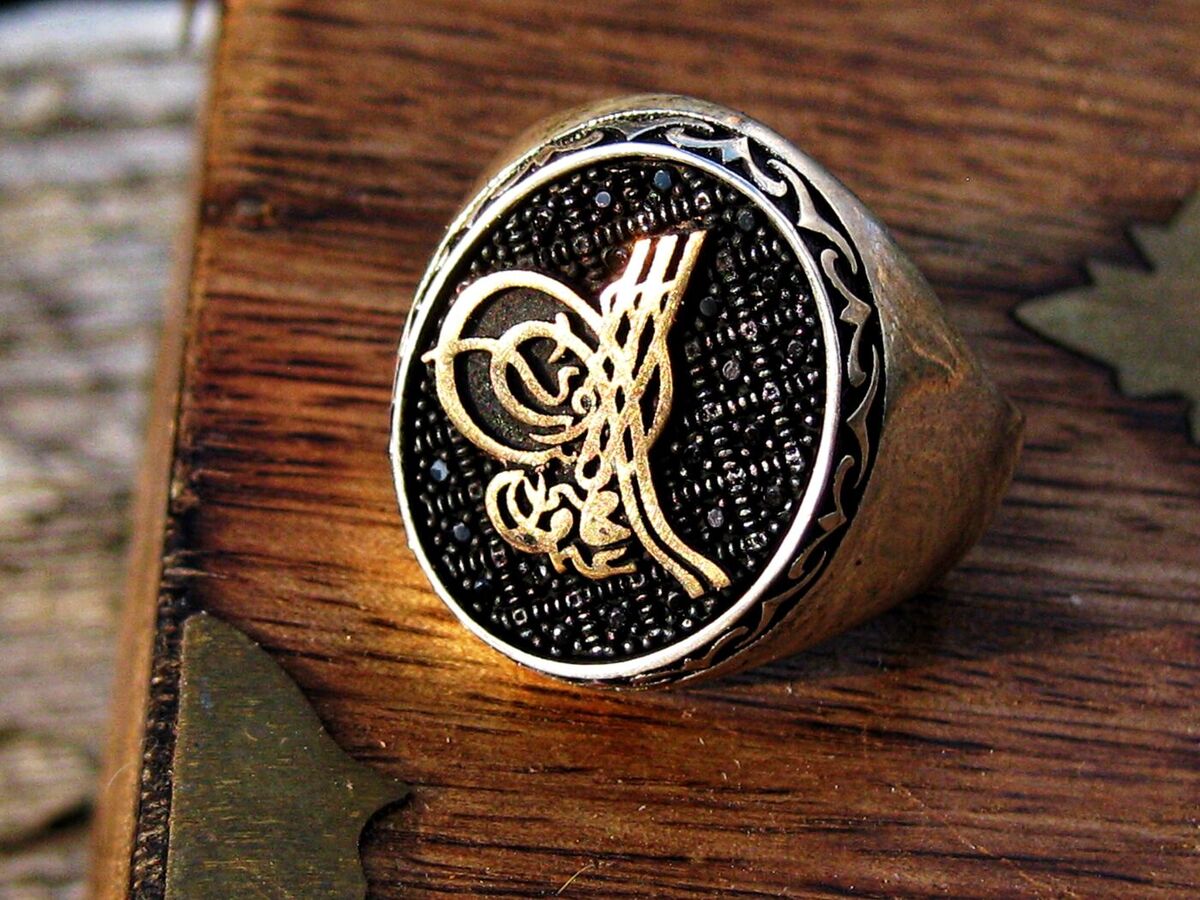 Ring: Vintage sterling silver. Size 11.5. Tugra Ottoman with signature of Suleiman the Magnificent in gold on the face of the ring.