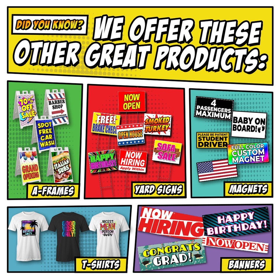 Tampa Printing uses heavy duty premium 13 oz indoor / outdoor vinyl banner material. All banners are printed using industry best latex ink technology, are UV and water resistant, and withstand hot and cold conditions. All banners include metal grommets in each corner for easy hanging. Larger banners receive additional grommets and reinforced hemming along all sides. All banner dimensions are Height (top to bottom in inches) and Width (left to right in inches).