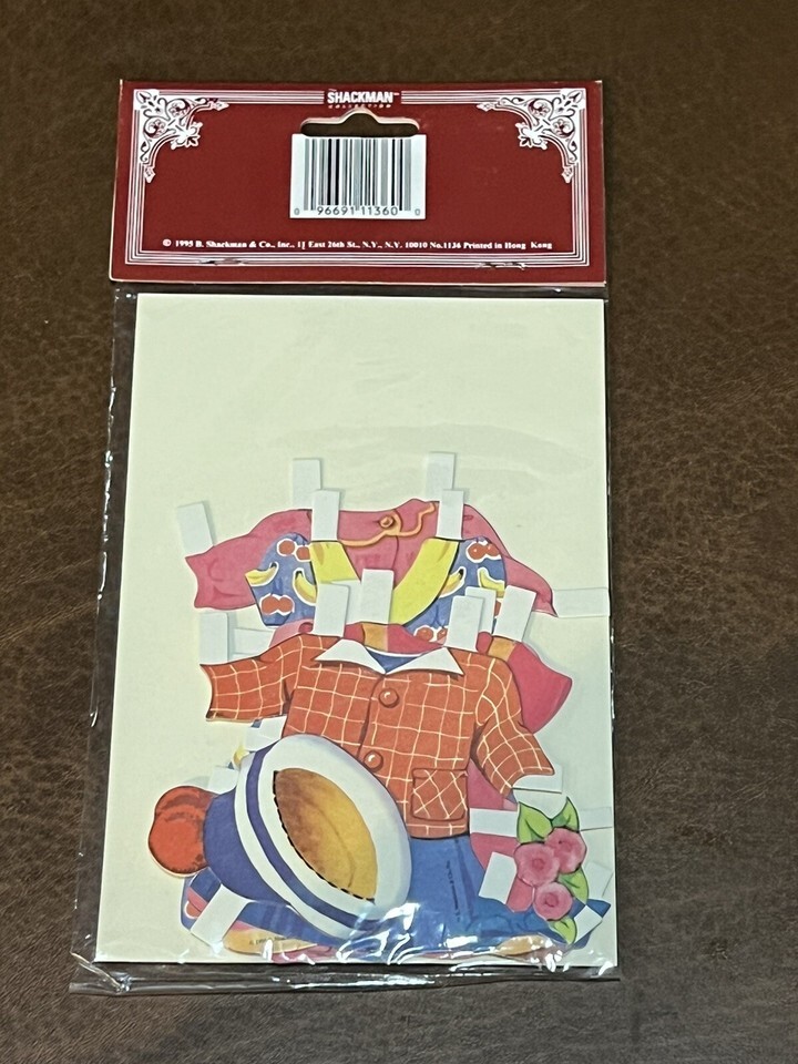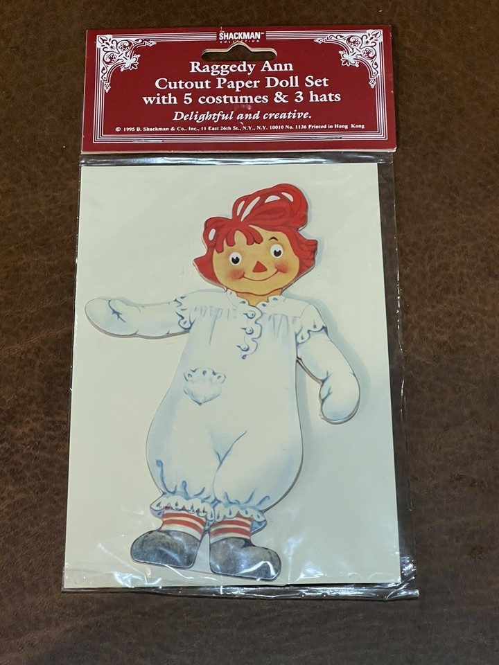 The product is a Raggedy Ann paper doll manufactured by Shackman in 1995. It is still factory sealed, meaning it has not been opened or used. The paper doll is designed for children and includes clothes and accessories for Raggedy Ann.