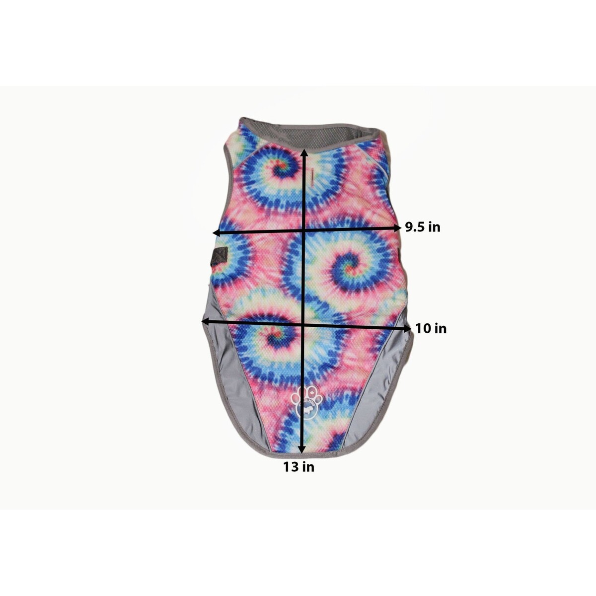 Canada Pooch Tie Dye Cooling Vest offers a vibrant psychedelic spiral pattern in pink, blue, and yellow to keep your pet stylish and comfortable. Designed with a functional mesh interior and adjustable side buckles, this vest is engineered to provide relief during warm weather through evaporative cooling technology. The lightweight construction and ergonomic fit ensure ease of movement for active dogs while the grey trim adds a clean, finished look.