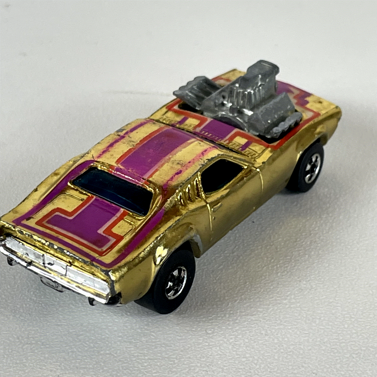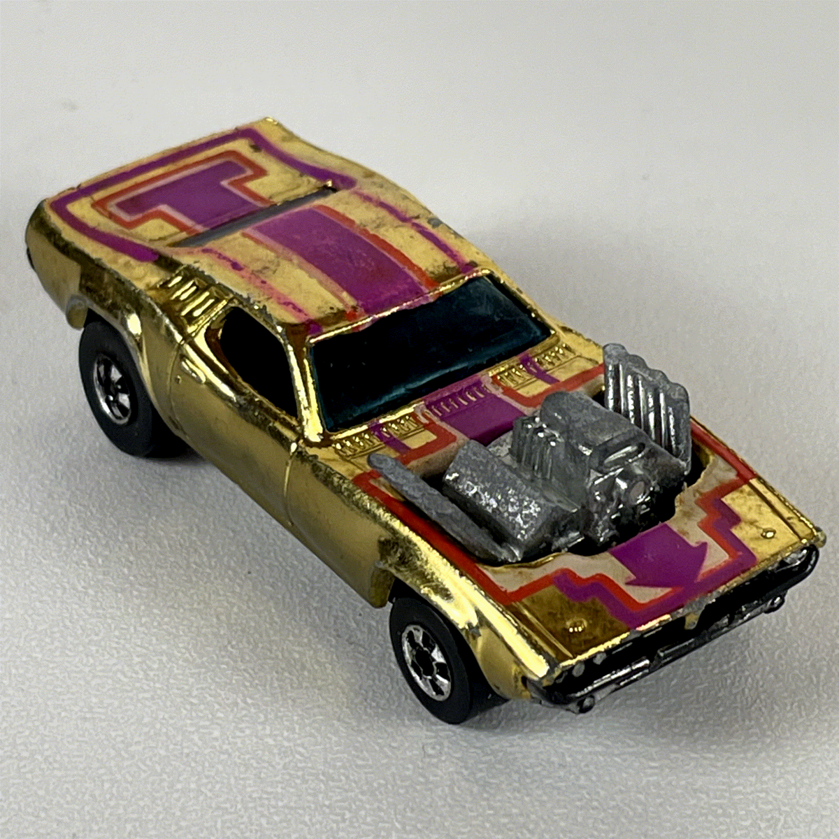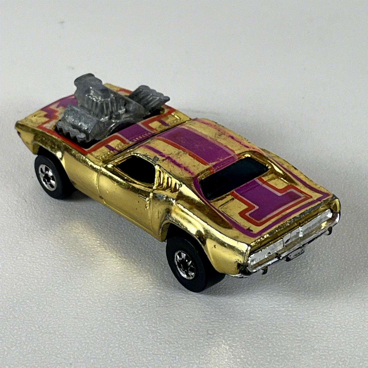 Discover this iconic Hot Wheels Spoiler II diecast model from 1969, a true vintage collectible that captures the essence of classic drag racing culture. This striking 1:64 scale car features a radiant gold chrome finish, accentuated by bold purple and red graphic stripes, making it a standout piece for any enthusiast. The exposed chrome-plated engine with intricate blower details adds an aggressive, high-performance look, characteristic of the era's custom hot rods. The dark tinted windows and detailed interior hint at the craftsmanship of this vintage Mattel creation.