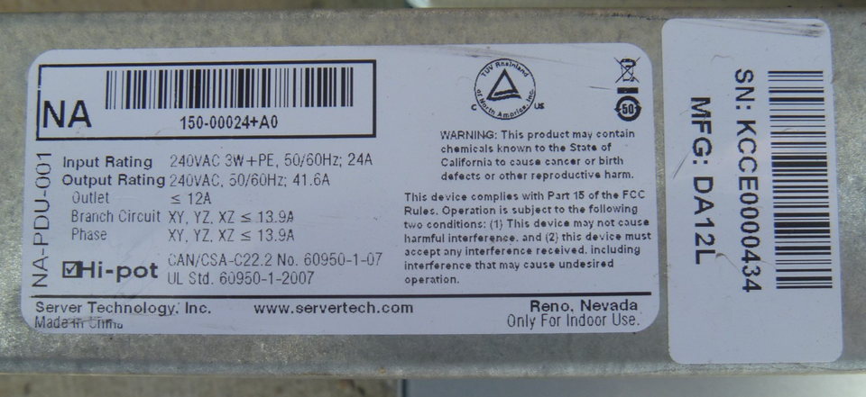 WORKING Server Technology CAN/CSA-C22.2 NO 609950-1-07 240VAC 50/60Hz NA-PDU-001