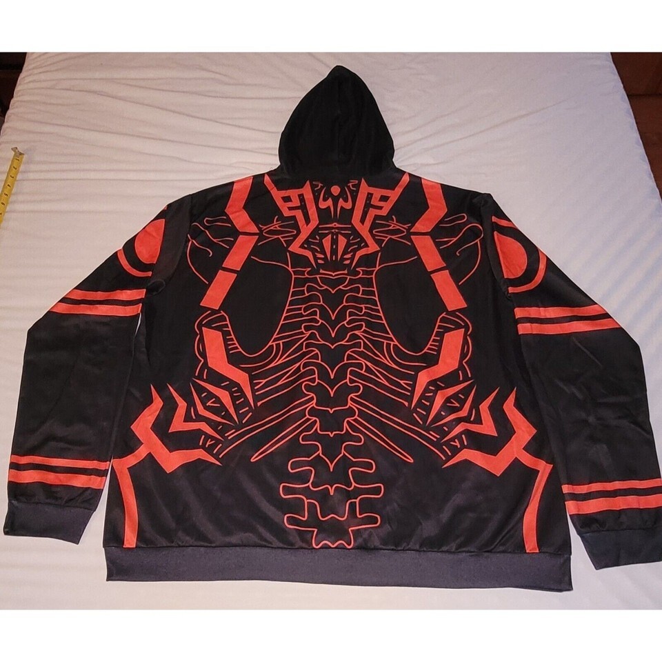This is a Fandomaniax Unisex Rib Sukuna hoodie in size 3XL. It features a black color with red accents and a graphic print of Ryomen Sukuna. The hoodie has a collared neckline, long sleeves with drawstring closure, and is made of polyester fabric. It is an athletic fit with a pullover style, hooded design, and pockets. Suitable for all seasons, this hoodie is machine washable and ideal for activities like walking, bodybuilding, and running.