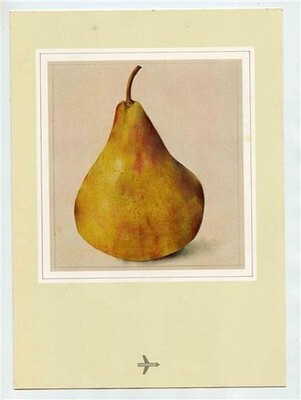 A 4 page Swissair Economy Class Menus with The Pear on the cover . Has information on the cover art by Kurt Wirth on the back of cover in 3 languages. In very fine condition, measures about 7 1/4" x 10" when closed. Circa early 1990's From flight from Switzerland to North America.