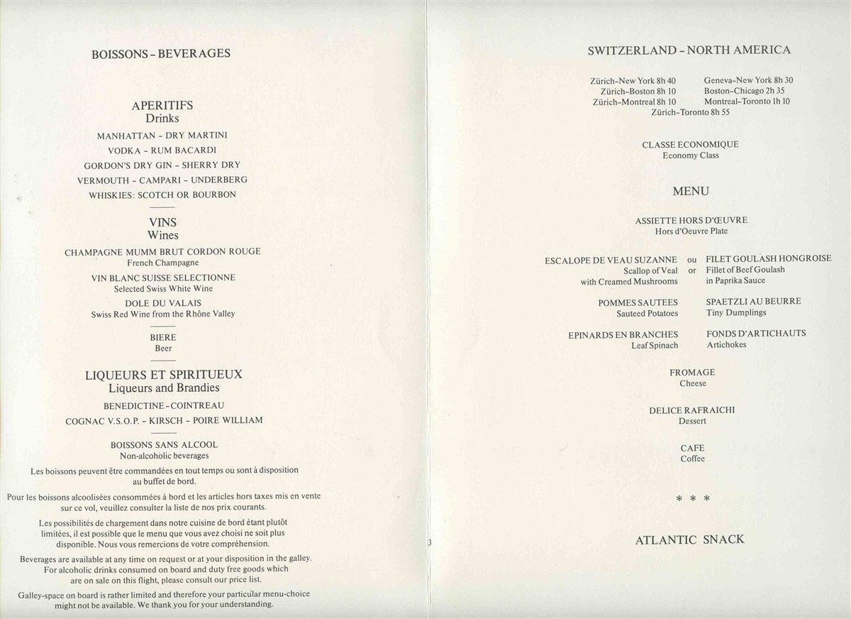 Swissair Menu 1990's Switzerland North America The Pear