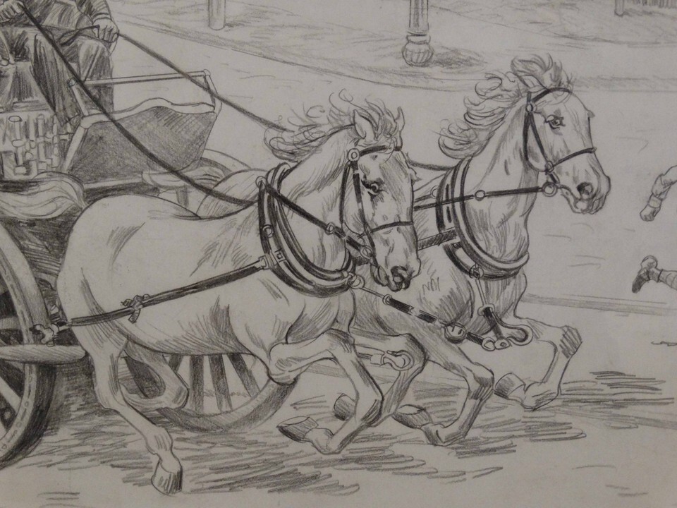 This framed pencil sketch is in preparation of the oil painting "Steamer 1902". Firefighting is the most admired profession risking their lives to save lives and properties of others. The old steam pumper being pulled by a team of horses with the smoke of the pumper falling behind. The image protrayed by this sketch is a dream of countless small boys and men alike. This is an orginal sketch and an incredible investment. The framed sketch measures 30" wide by 27" tall.