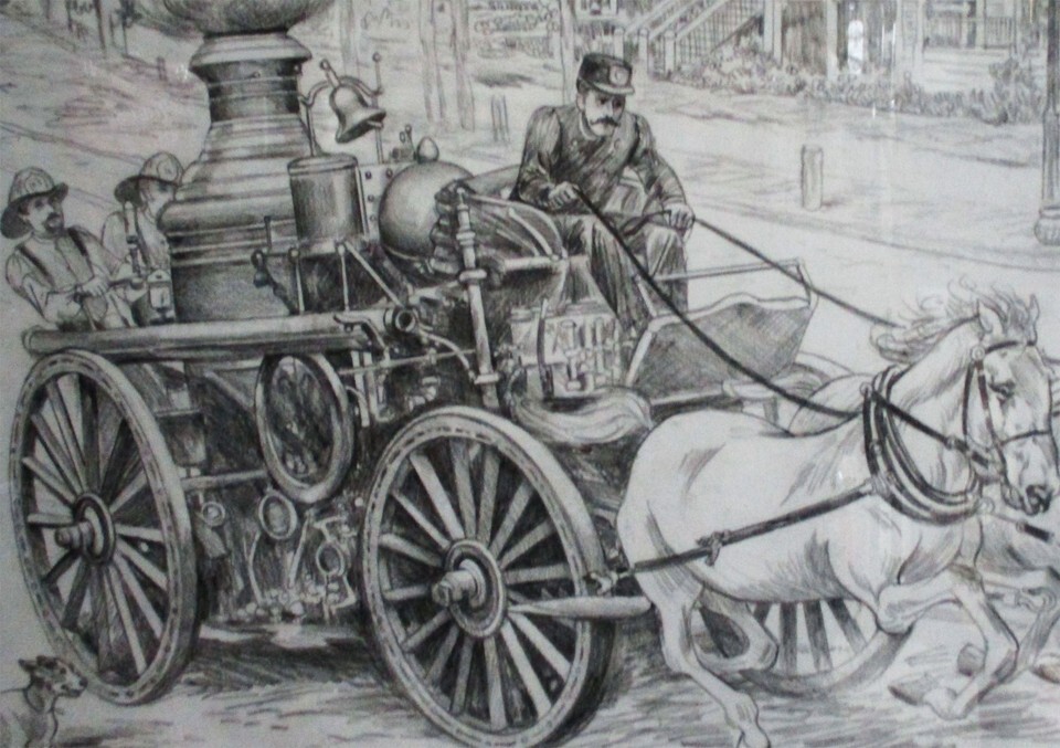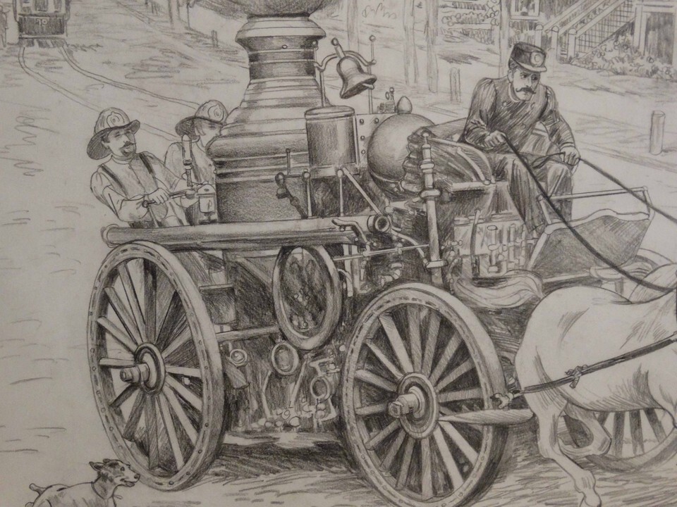 Steam Engine Firefighters Original by Lee Dubin Pencil Sketch
