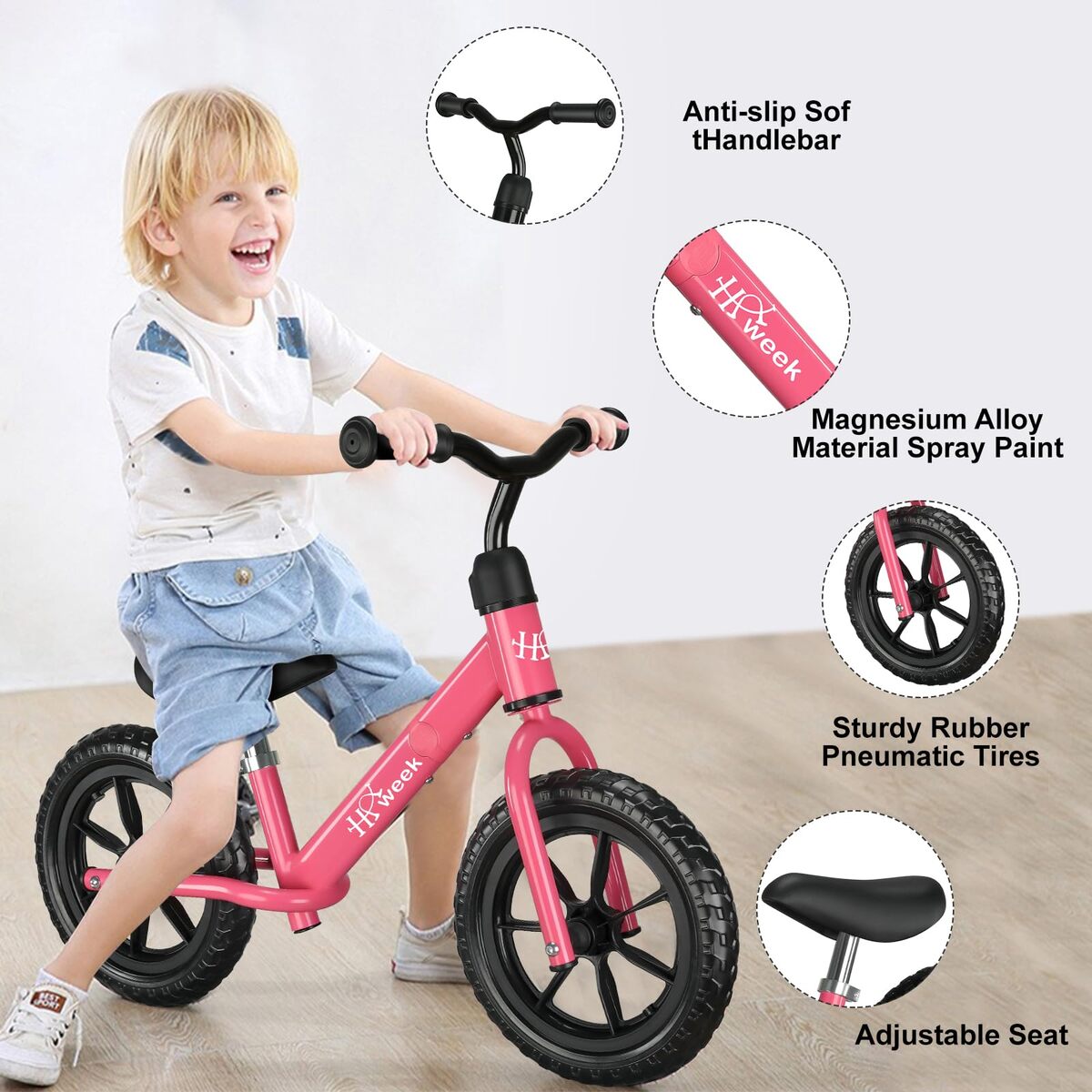 What Is A Balance Bike? : HAWEEK balance bikes are designed to focus on a simple goal: learning and training balance. Through this way, your children will also learn coordination and confidence with this no pedal bike. Our push bikes are a safe, fun and faster way for kids to learn how to ride a bike.,Sturdy Comfortable Design: The toddler balance bike equips sturdy aluminum alloy frame, non-slip PU handle, and a softly supportive seat. The balance bike wheels are non-slip, wear-resistant and non-destructive floor, and baby can ride indoors or outdoors.,Easy To Adjust : As your child grows, you can adjust the seat handlebar heights?no tools required. HAWEEK balance bike grows seamlessly with your child and can be used up to age 5! Plus, the EVA tires will never go flat!,Easy to Carry : With only 3.5kg (7.7 pounds) of weight, both you and your children can easily carry it around to play. By removing the middle steel part, the balance bike can be split into two parts, making it easy to take outdoors, no need to worry about the children giving up because they can?t move it without your help.,Finest Gift Option : Opting for balance bikes as a birthday surprise, Christmas present, or unique gift choice guarantees an unparalleled experience for children. ?Letting them enjoy a memorable and fantastic first ride will undoubtedly bring more joy and fun into our lives