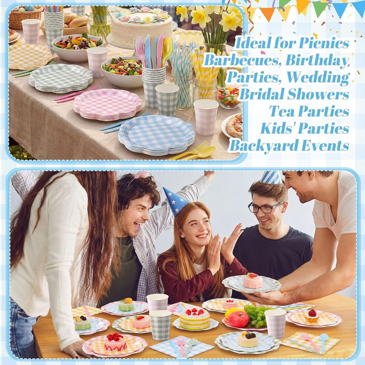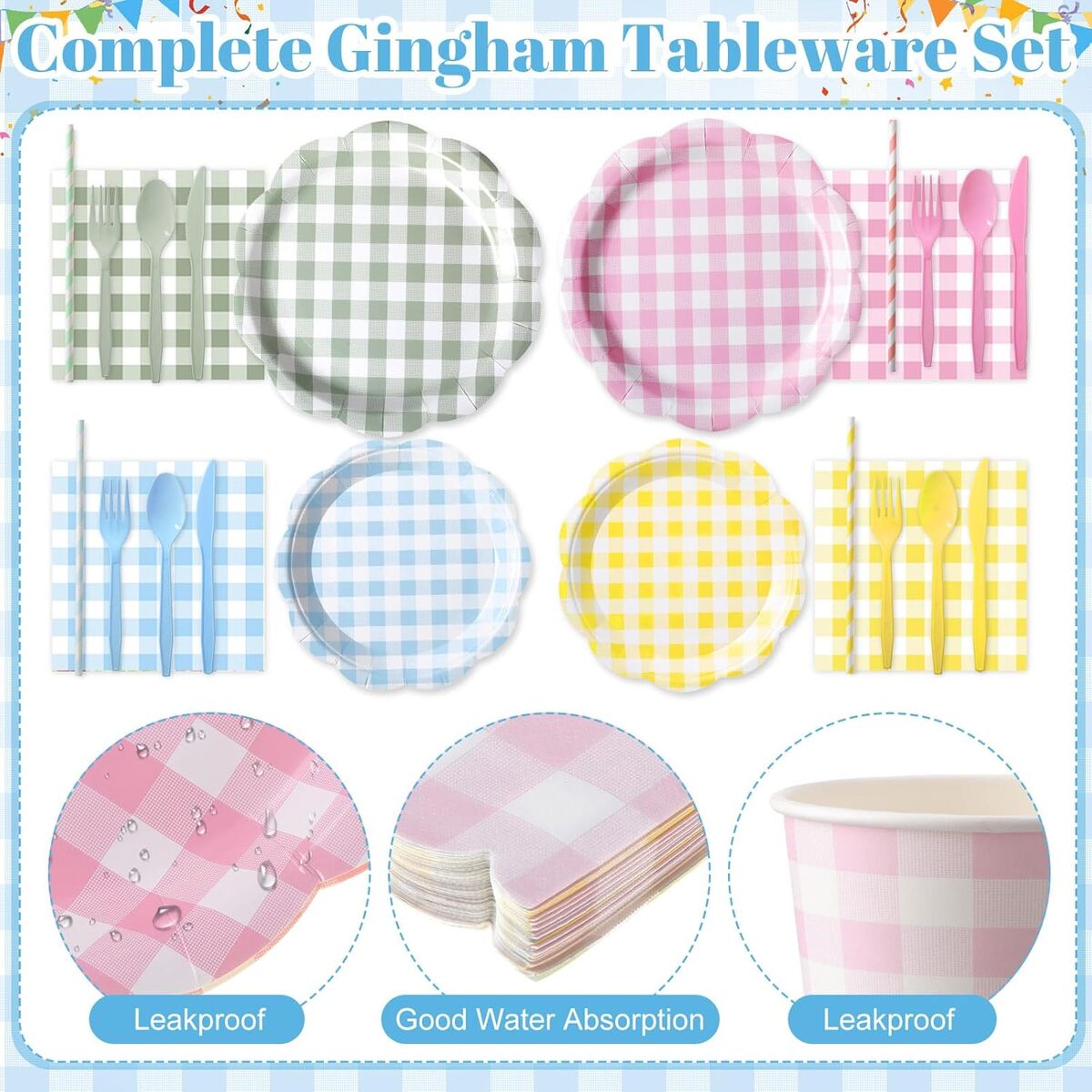 ? Add color, charm, and convenience to your celebration with this elegant pastel gingham party set.