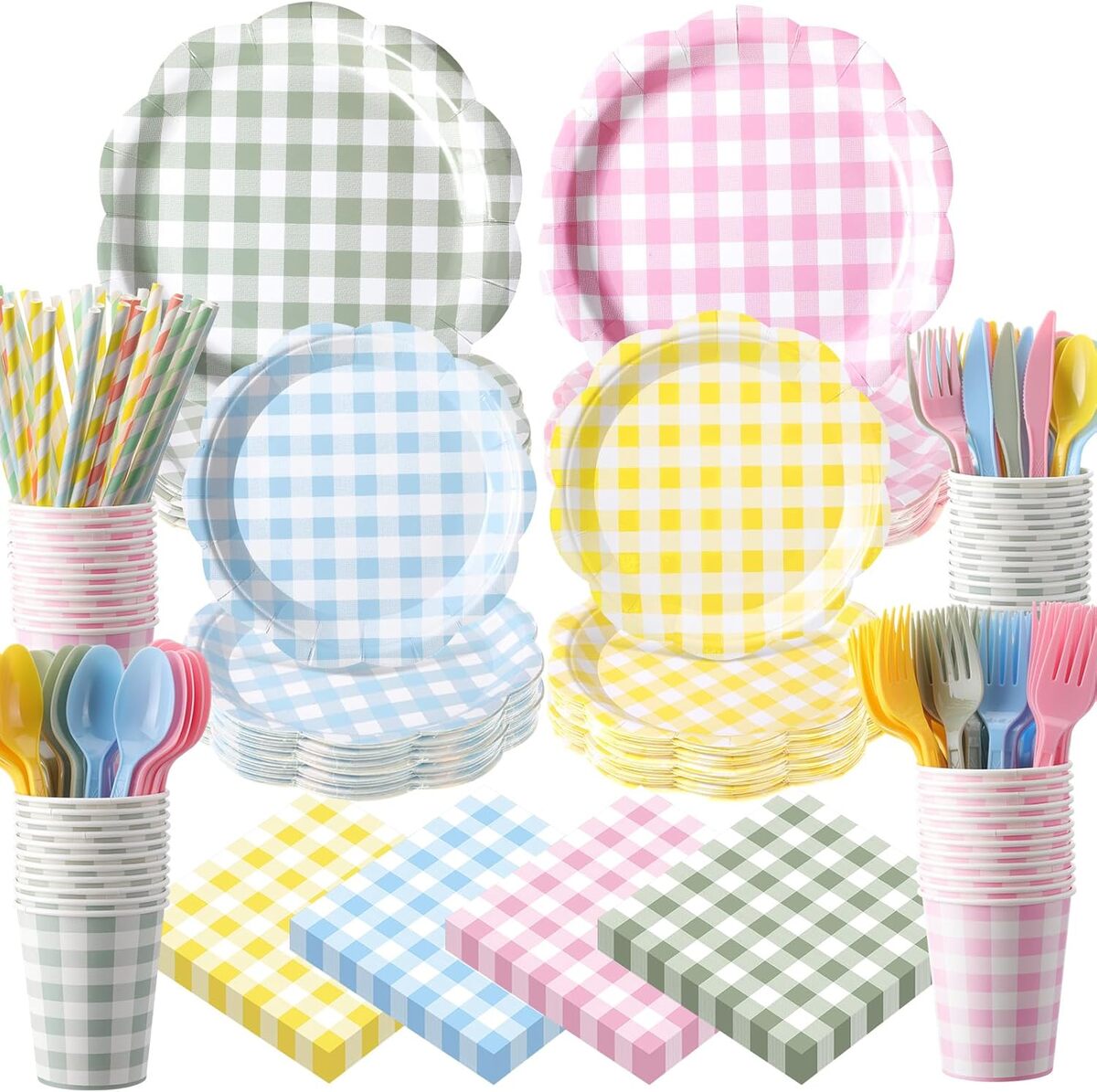 Create a charming and coordinated celebration with this beautiful Pastel Gingham Party Tableware Set for 50 Guests. Featuring cheerful pastel plaid patterns, this complete set is perfect for picnics, baby showers, birthdays, BBQs, weddings, and spring gatherings.