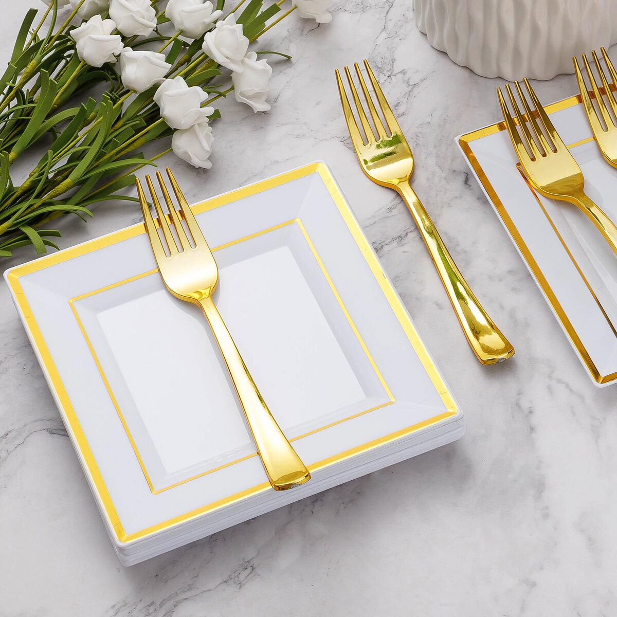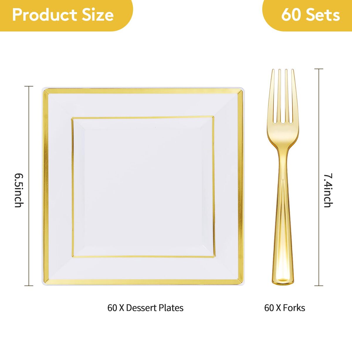 100% BPA Free - The disposable plates for party are made of food-grade, reusable plastic that is BPA-free. If you need to reuse the plates, simply wash them with water. NOTE: Plastic plates for party are not recommended for use in the microwave or dishwasher.,ELEGANT DESIGN - Square dessert plates with dessert forks are ideal for serving appetizers, wedding cakes, salads and desserts, snacks, and fruit salads. The gold design of the plates can be matched with a variety of colored dinnerware for all occasions.,IDEAL FOR PARTIES - With square disposable dessert plates, you can easily host a party without worrying about clean-up at the end. You can throw them in the trash after use. These dessert plates are great for weddings, holidays, baby showers, business parties, Thanksgiving, Halloween, and Christmas dining.,STURDY DURABLE - The heavy-duty square plastic plates are made of hard plastic and are thick enough to hold any food. The gold dinner plates will not scratch easily and can easily handle hot, cold, and wet food without leaks or spills.,WHAT'S YOU GET - A convenient 120PCS that includes 60 x 6.5" gold square dessert plates and 60 x 7.4" plastic forks. Our disposable plates ensure a hassle-free post-party experience, freeing you to savor moments with family and friends instead of worrying about cleanup.