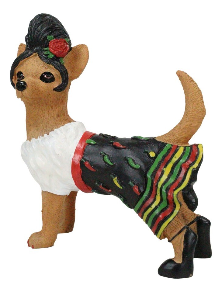 ? This senorita caliente chihuahua dog in traditional outfit is a fun decorative sculpture for your desks, shelves or what have you! Everyone loves chihuahuas! This missy caliente has her hair done up beautifully, finished off with a rose hair tie. She wears a traditional mexican dress outfit with a white top and colorful skirt bottom with chili peppers and more! Her front paws are manicured while her back feet are wearing pumps.