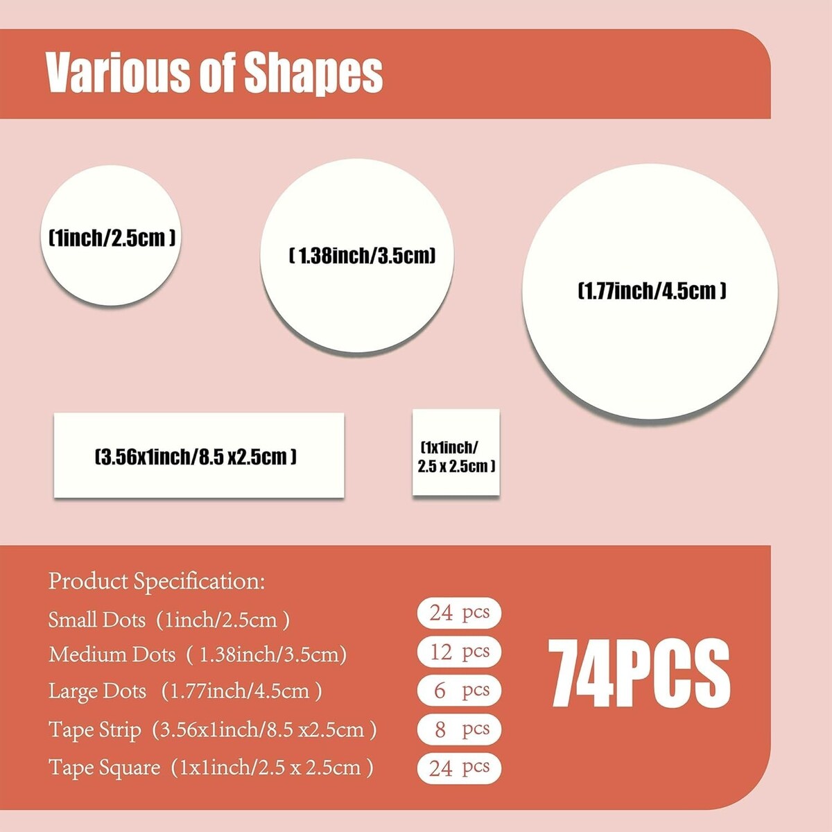 - Our multipurpose adhesive tape can be used to fix pictures, posters, photos, paintings, balloons, hooks, carpets, sockets, crafts, decorations, etc. Suitable for home, office, school, party and other occasions. You will get 74pcs pre-cut double sided tape including 42 circles in 3 sizes, 8 strips, and 24 squares.