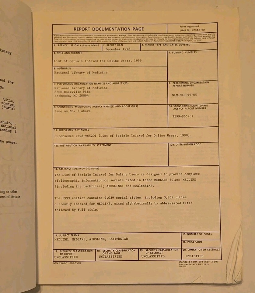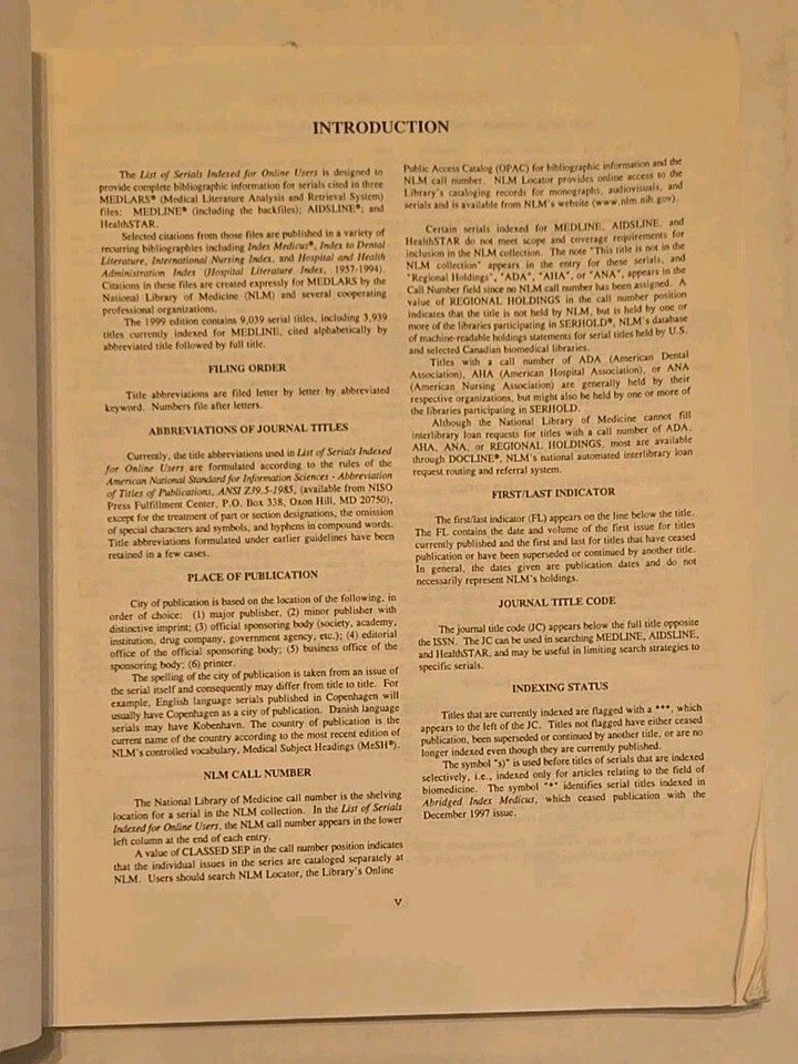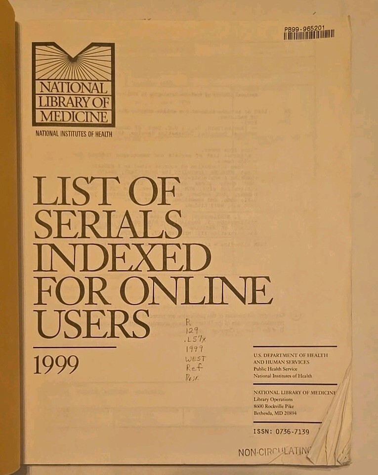 This is a bibliographic index of serials indexed for online users in 1999 by the National Library of Medicine. It contains information on publications related to health and medicine, including textbooks, dictionaries, and reference materials. The index is categorized by subject area and includes the publication name, author, and publication year.