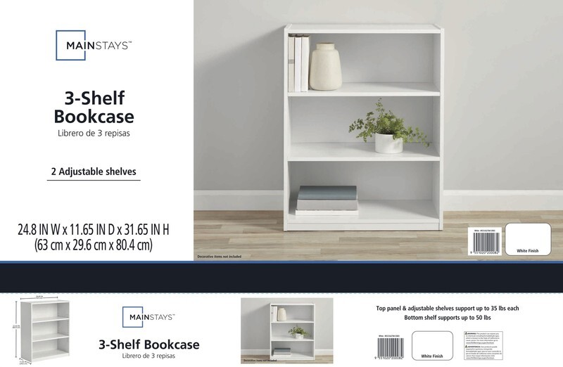 Add the sleek Mainstays 3-Shelf Bookcase with Adjustable Shelves to any room for a functional and stylish look. This sturdy storage unit has a closed back design with one fixed shelf that holds up to 50 lbs, and two adjustable shelves that support up to 35 lbs each. Quick and easy to assemble, this attractive bookshelf is a useful storage option for any office, living room, family room, den and more. At 31" tall the Mainstays 3-Shelf Bookcase is perfect for small and medium rooms where smart, efficient storage is needed. The adjustable shelves accommodate everything from paperbacks to large folios, perfect for small libraries and collections.
