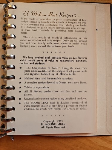 Vintage cookbook published by El Molino Mills in 1953 to promote the use of their flours and mixes so mostly a baking cook book. El Molino Mills was located in Alhambra, California. There are recipes for: Breads and Rolls, Cakes and Pastries, Soups and Sprouts, Hot Cakes and Waffles, Casseroles and Gluten(?). There are conversion charts, discussions of different kinds of flours and description of all the different El Molino products. Interesting from a historical perspective