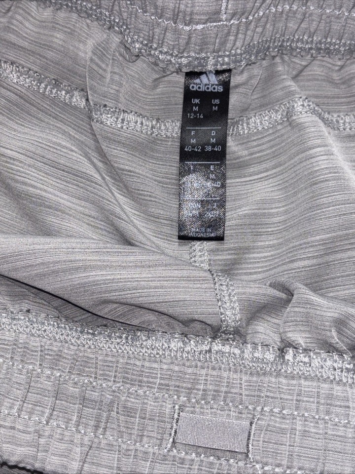 The product is a pair of Adidas women's athletic shorts in medium size and gray color. Made of 100% polyester with features like an elastic waist, comfort, and breathability, these shorts are ideal for running and other active occasions. The Aeroready technology ensures moisture-wicking performance, making them a practical choice for women looking for high-quality activewear that provides both style and functionality.