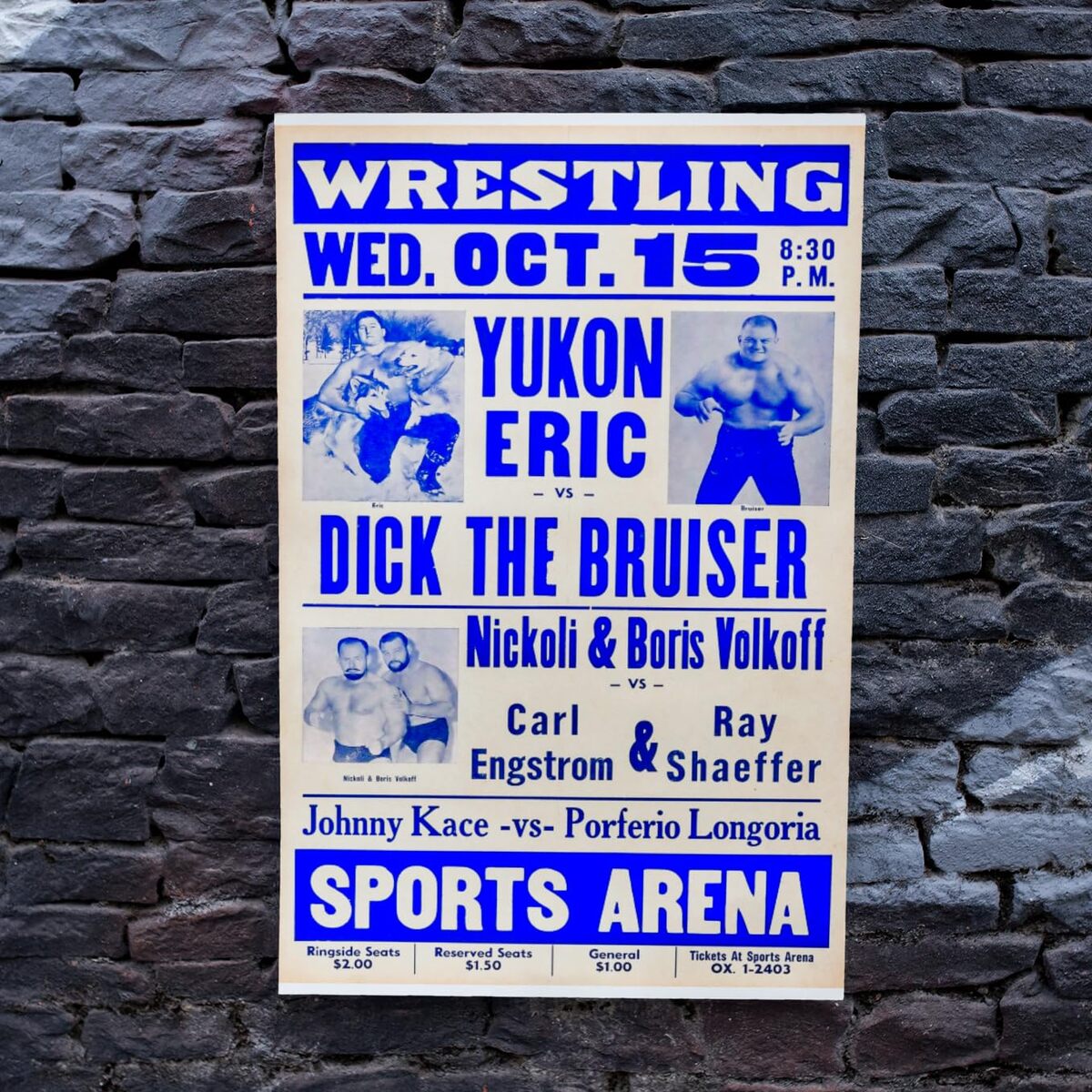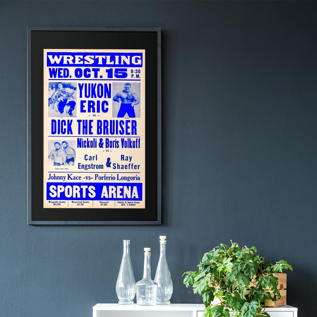 Product description: Transform your space with this striking vintage wrestling poster print that captures the raw energy of classic American wrestling. This 11" x 17" wall art features a bold blue and white design advertising an epic matchup between Yukon Eric and Dick the Bruiser at the Sports Arena, along with other thrilling bouts. The poster showcases the golden age of wrestling, complete with dramatic photographs and eye-catching typography characteristic of the era. Perfect for wrestling enthusiasts, sports memorabilia collectors, or anyone looking to add a touch of nostalgic Americana to their decor. The print maintains the authentic look of the original event poster, right down to the detailed ticket pricing and venue information. Made in the USA, this high-quality print serves as both a piece of wrestling history and striking wall decor that's sure to be a conversation starter in any room.