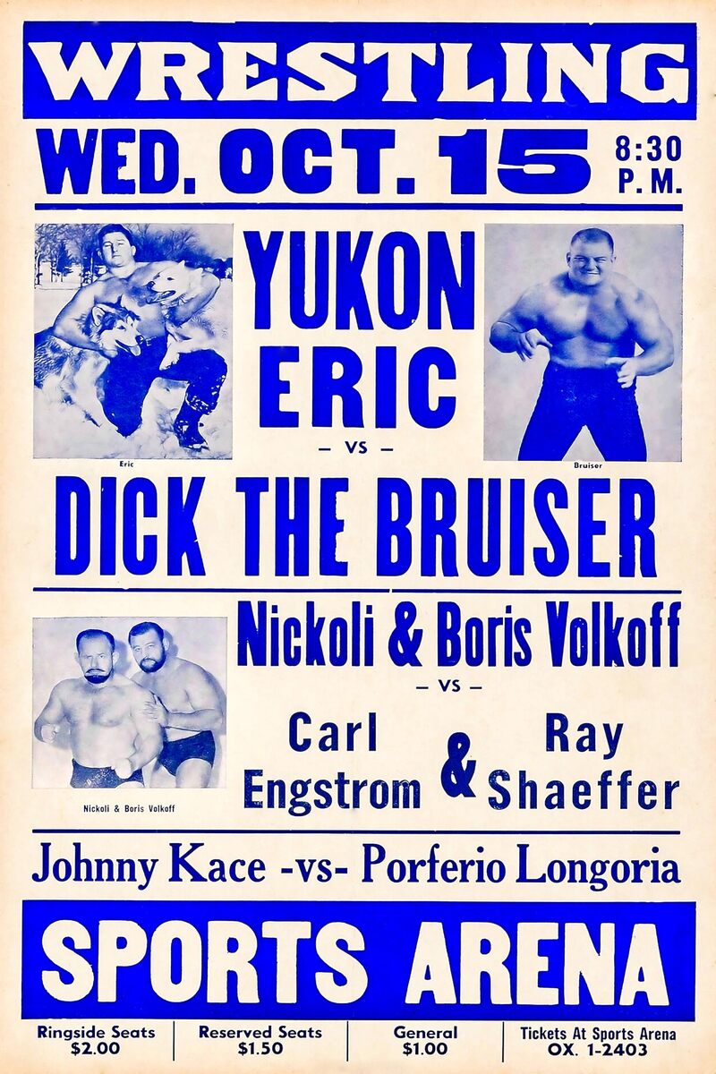 Transform your space with this striking vintage wrestling poster print that captures the raw energy of classic American wrestling. This 11" x 17" wall art features a bold blue and white design advertising an epic matchup between Yukon Eric and Dick the Bruiser at the Sports Arena, along with other thrilling bouts. The poster showcases the golden age of wrestling, complete with dramatic photographs and eye-catching typography characteristic of the era. Perfect for wrestling enthusiasts, sports memorabilia collectors, or anyone looking to add a touch of nostalgic Americana to their decor. The print maintains the authentic look of the original event poster, right down to the detailed ticket pricing and venue information. Made in the USA, this high-quality print serves as both a piece of wrestling history and striking wall decor that's sure to be a conversation starter in any room.
