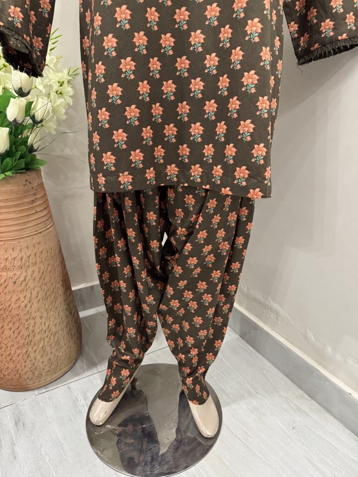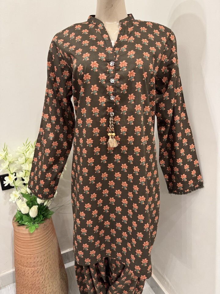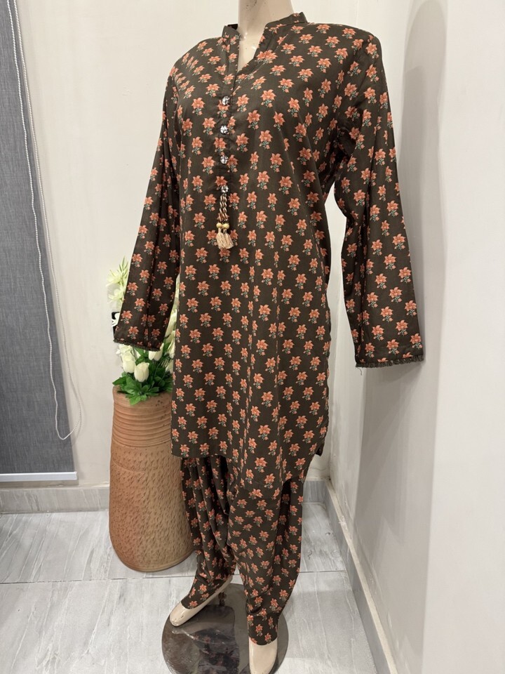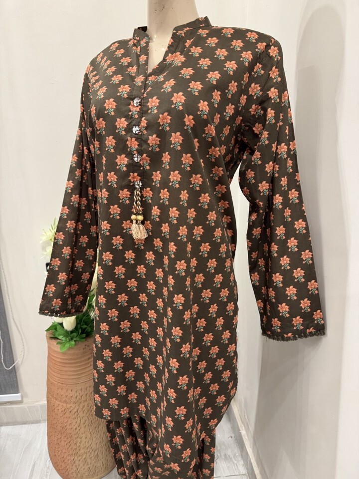 Pakistani Brown Printed Straight Shirt Lawn Suit ,printed Lawn duppata and Plain dhoti shalwar .