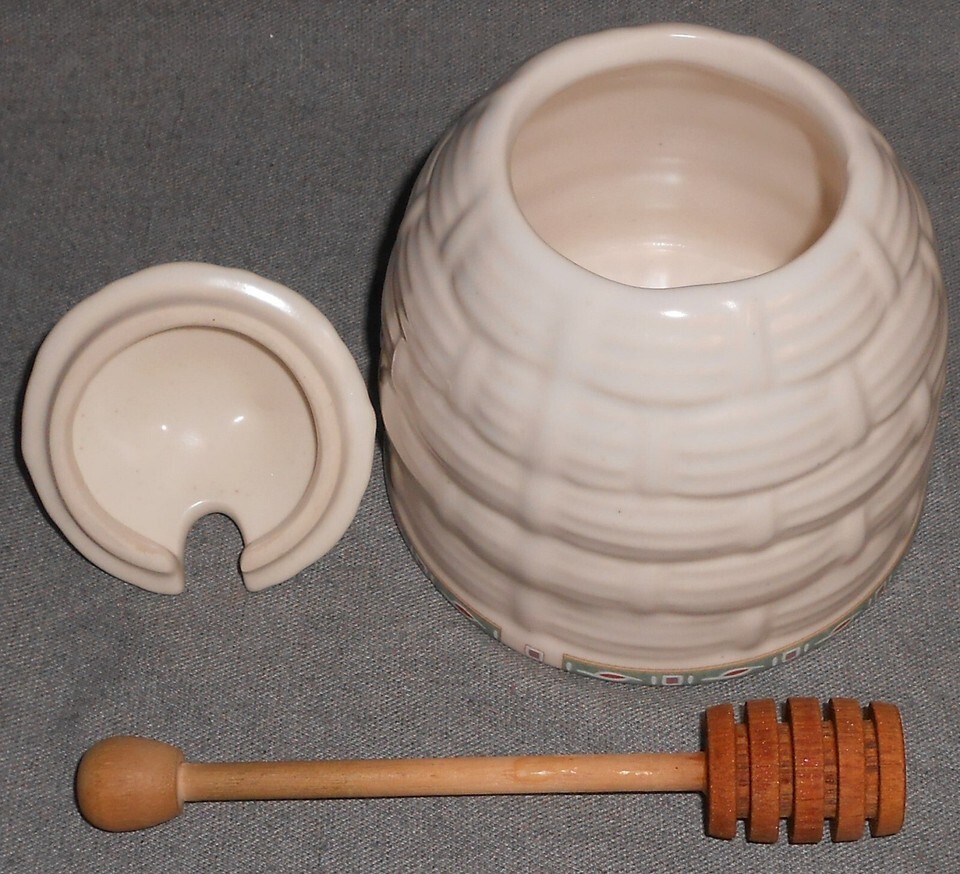This is the Stoneware Honey Pot w/Lid and a wood utensil from Pfaltzgraff Portfolio in the Naturewood Pattern. It measures approx 5 1/2" tall to top of lid and approx 4 5/8" in diameter at base and i tis in good pre-owned condition with no chips or damage and appears ot have never ben used.