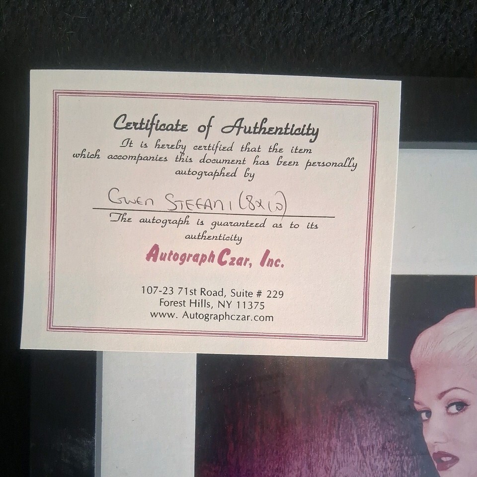 The product being described is a rare and valuable 8x10 photograph of music superstar Gwen Stefani, signed by the artist herself. This autographed piece of entertainment memorabilia holds a special significance as it is an original item, not a reproduction. With a Certified Collectible Authenticity (COA) from Czar, this signed picture offers fans and collectors a unique and cherished memento from one of the most iconic figures in the music industry. Perfect for any music enthusiast or avid autograph collector, this item showcases the star's personal touch and adds a touch of glam to any collection.