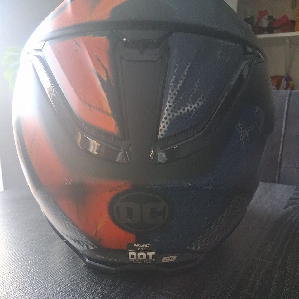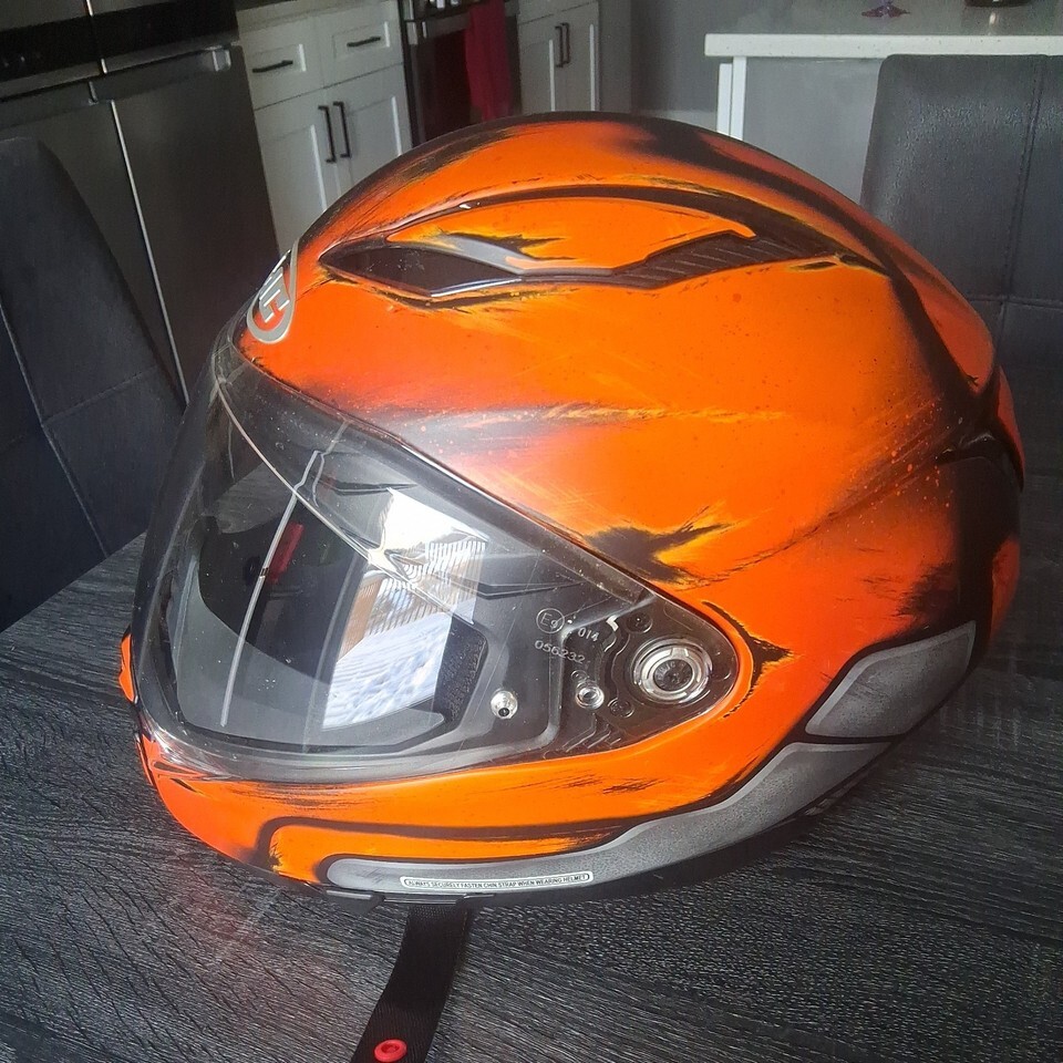 The HJC F70 Motorcycle Helmet in size XL features a stylish orange and blue color scheme with a green/grey base. It is designed for unisex adult riders with a multi-composite shell construction and a double D style closure. The helmet comes with a DOT label and certification, making it suitable for on-road use. It also includes features such as a moisture-wicking interior, ventilation, and a fully removable interior for added comfort and convenience. The integrated sun visor offers added protection from the sun's glare while riding. some scratches as shown in pictures