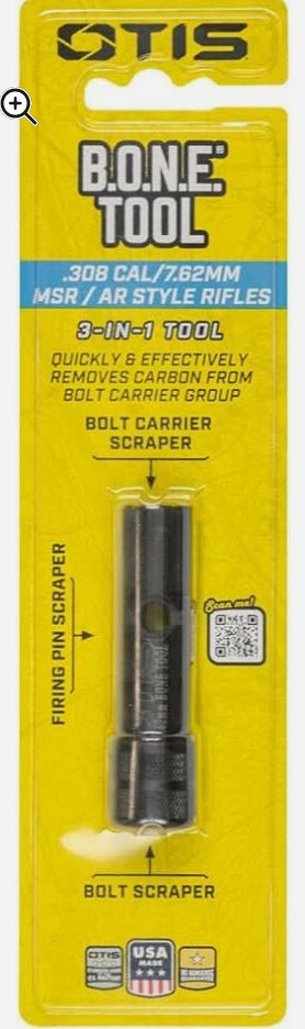 The Otis BONE Tool 3 in 1 Tool is a versatile cleaning kit designed for deep cleaning .308/7.62 caliber rifles. Made by Otis Technology, this tool includes a bolt carrier scraper and is reusable. Constructed of durable metal and in a sleek black color, this tool is lightweight at 0.40 lbs and made in the United States. Perfect for gun enthusiasts looking to maintain their firearms with a high-quality, efficient cleaning solution.