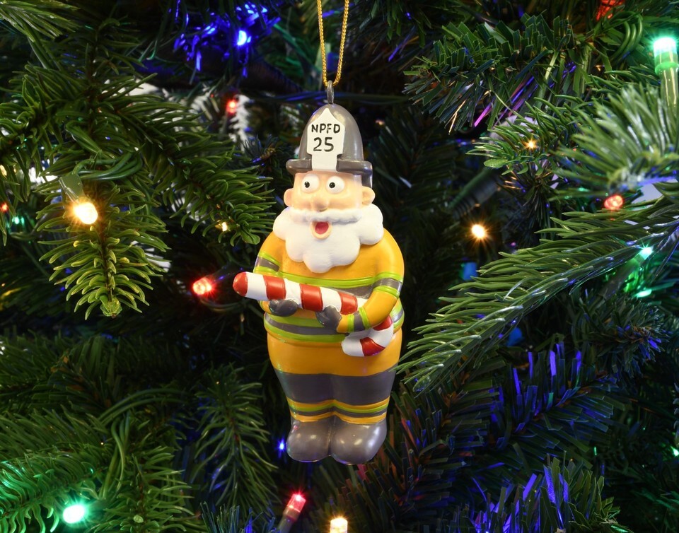 This fun Santa Claus fireman ornament shows Santa with his firefighters jacket and helmet. Which says NPFD station number 25. He also has a candy cane for a fire hose, adding a cute and playful touch to the ornament.