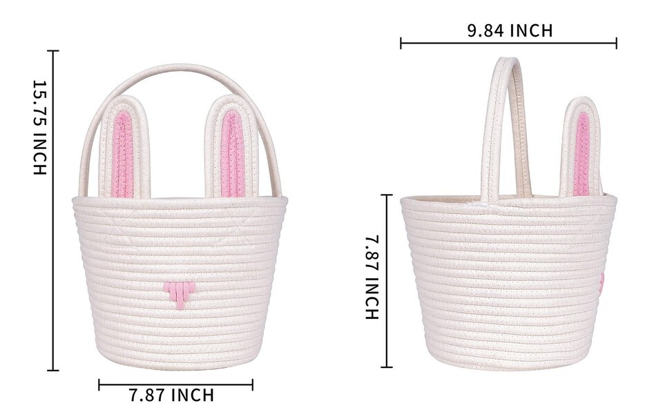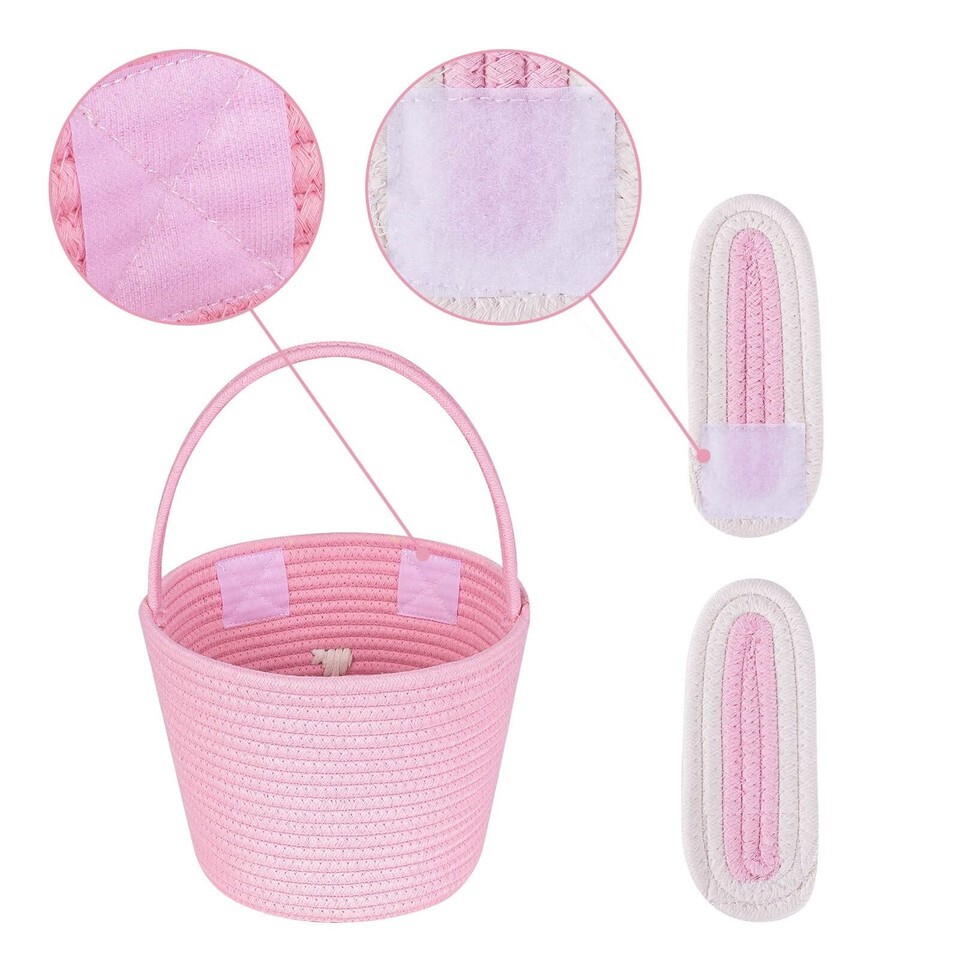 Cute Easter basket has good stability, hand-woven, soft skin-friendly material, no strong smell, durable, empty basket, size 9.8 x 7.8 x 7.8" can hold many small items. Will be good for egg hunt or children's decoration,An Adorable Easter gift: Prepare for the annual Easter egg hunt with the adorable Easter Bunny basket. Collect all your eggs and treats in this adorable bunny basket! With their cute faces, these baskets are sure to become a favorite Easter treasure,Unique Desgin: Colorful Easter basket with removable velcro ears. The viscosity is very strong, as long as it is aligned and stuck in the right place. Two removable bunny ears lively and vivid, highlighting the ornamental and cuteness of the basket.,Easter is the beginning of new life in spring and the bunny is the symbol of Easter. The colorful bunny basket is designed for children's Easter activities. Perfect for holds Easter Eggs, Candies, etc,Versatile and classic. Great for sending to loved ones near and far to make them feel extra special. Store collectables, show off decorations and flower arrangements or place around your home as a stylish, practical feature.