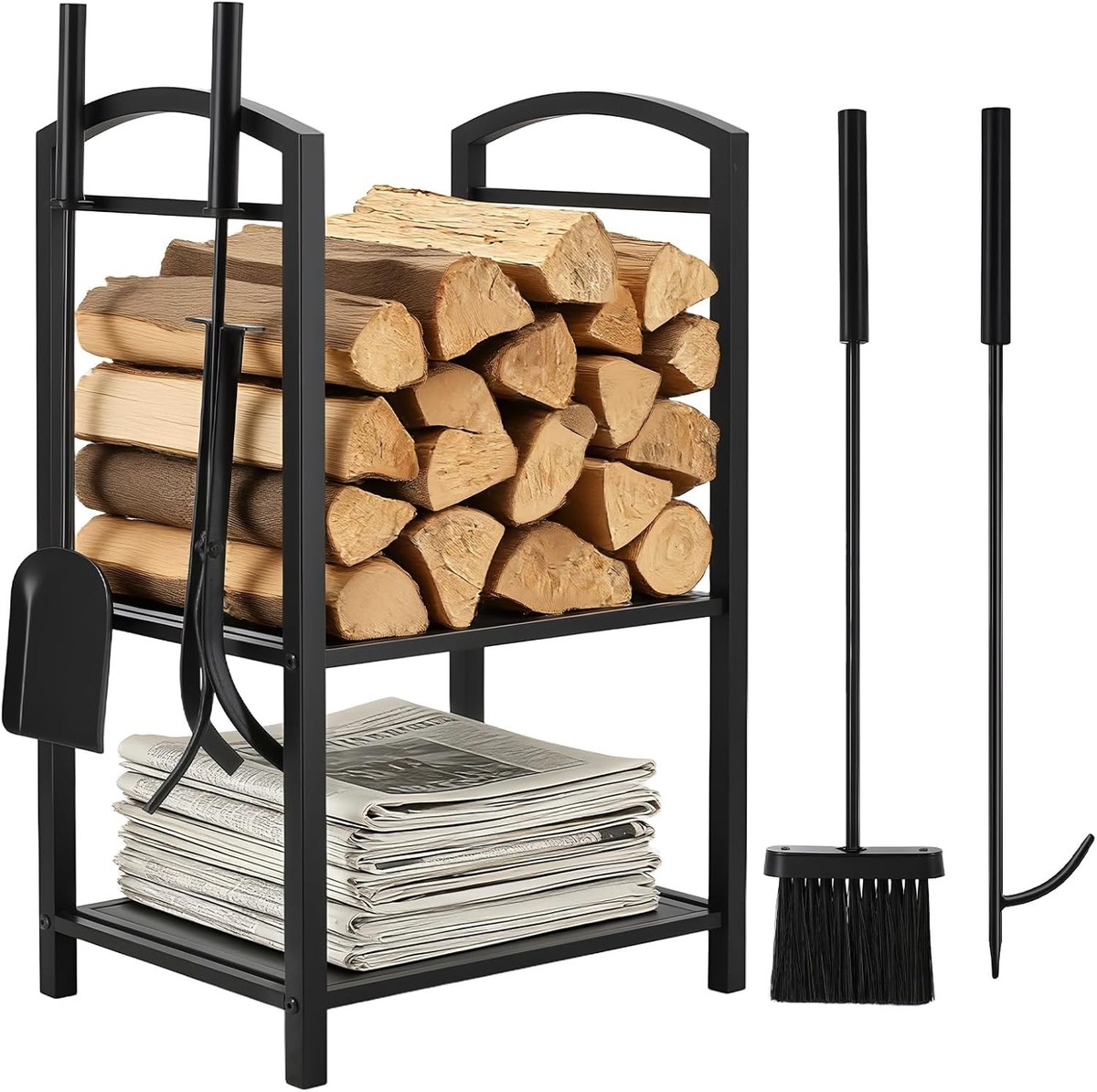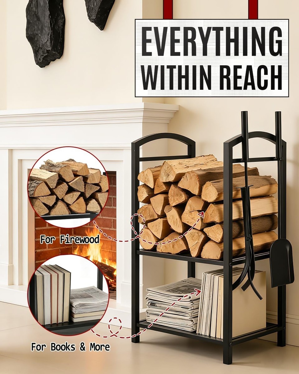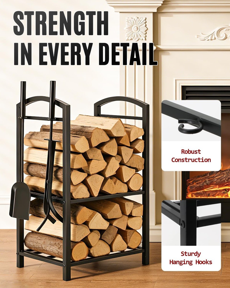 Set Comes With 4pcs Firewood Tools: Integrated hooks on the stand allow for convenient hanging of the accompanying fire tongs, poker, broom, and shovel.