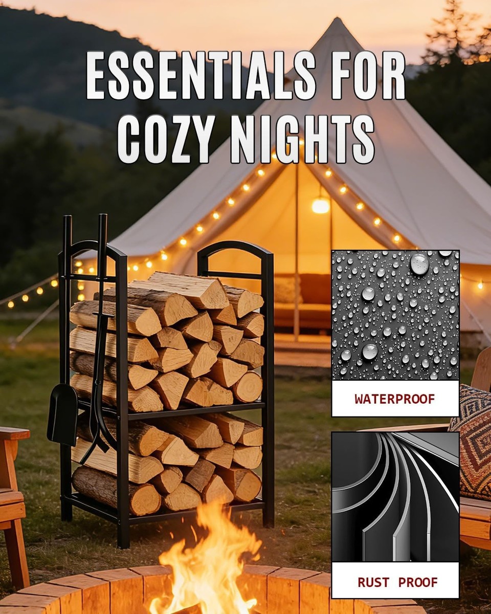 Elegant 29in Indoor Firewood Holder with Rustproof Tools - Space-Saving Design